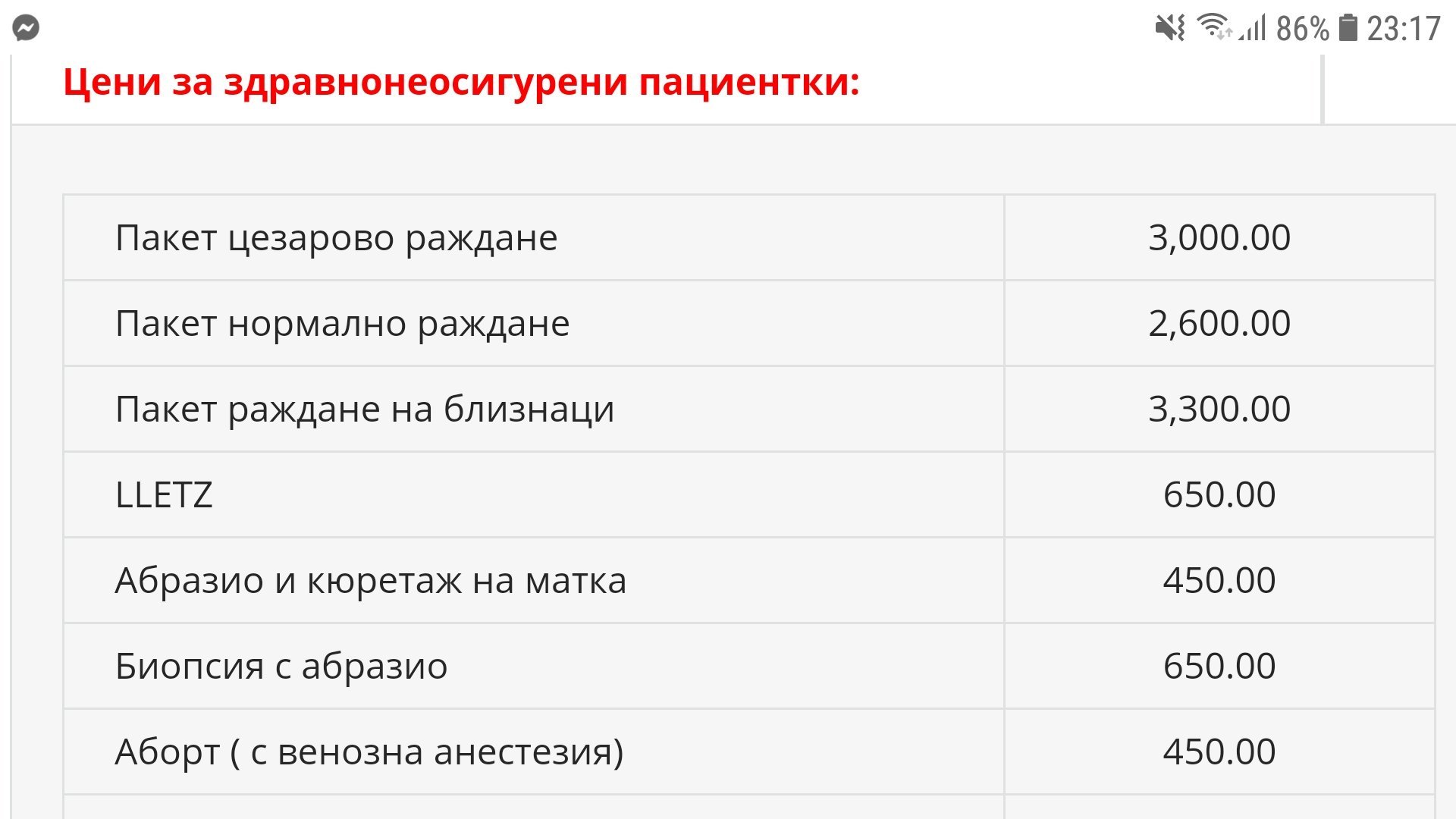 В момента на сайта им пише цезарово 3000.00лв., нормално 2600.00лв. за здравно осигурени пациенти...