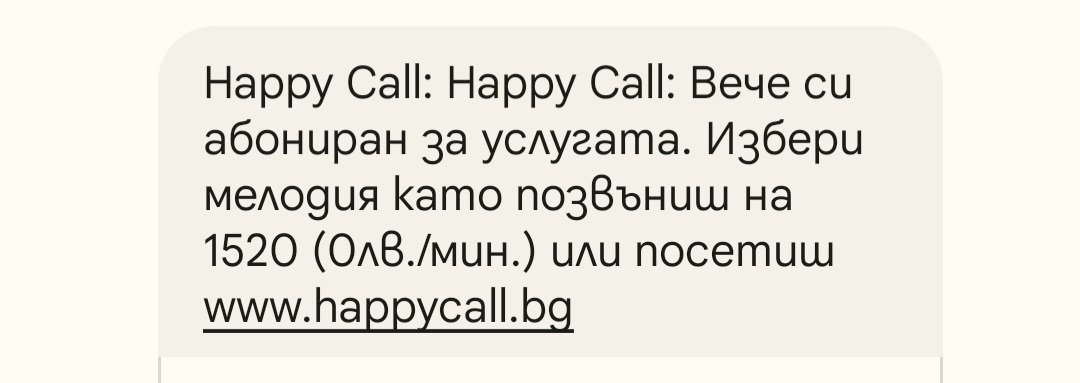 Преподписах план към Виваком, и дойде ето този смс. Пак ще си погледна договора, но се чудя тази услуга Happy Call (дето не ми трябва) дали ще ми се таксува допълнително или е включена в абонаментния план?..