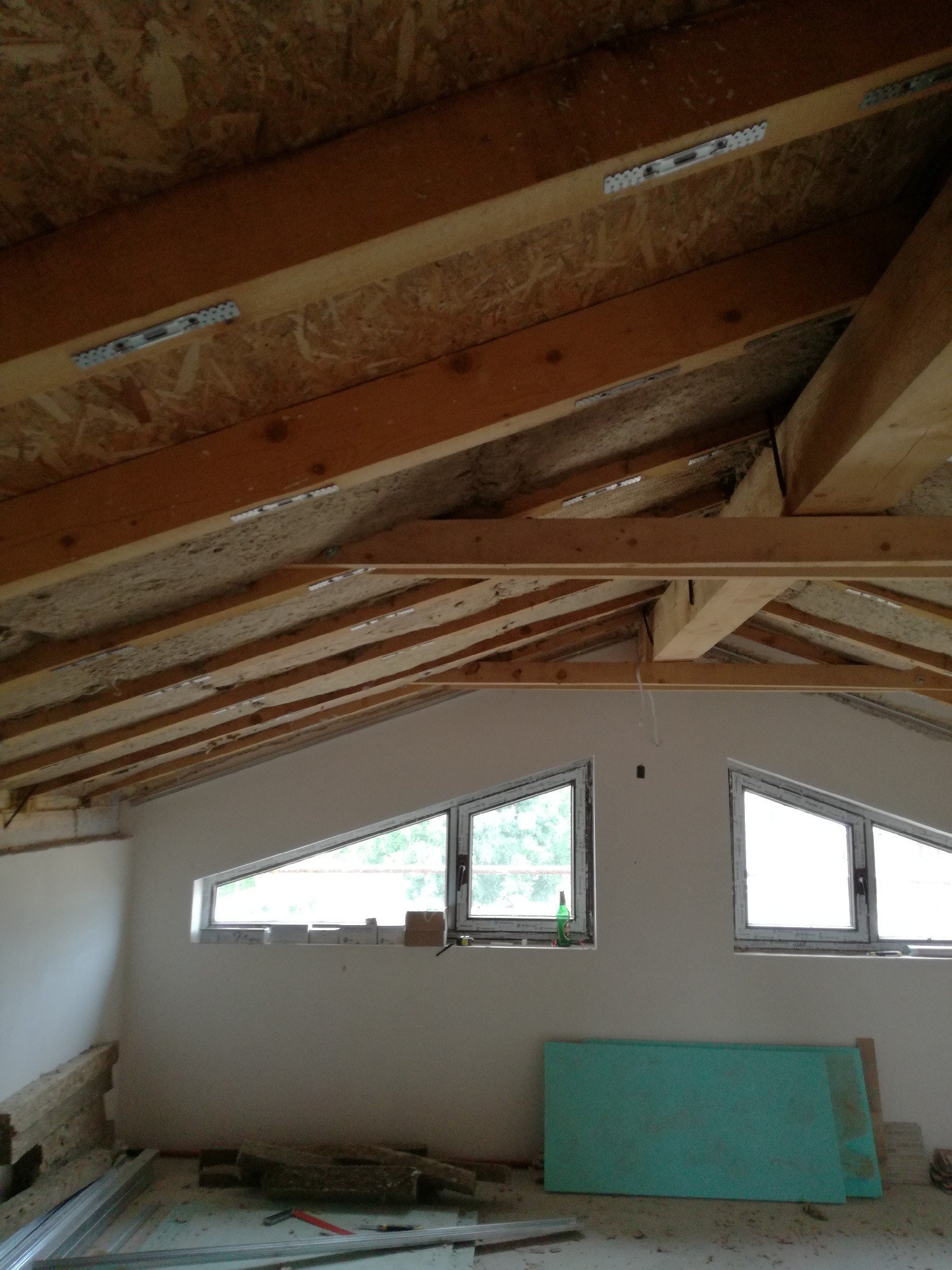 Искахме да има по-малко стаи, повече въздух и светлина, имаме много прозорци, включително и при входната врата и отгоре, над нея, където цялото пространство е прозорец, около 4 метра, отварящи се към терасата стъклени врати. ..........................Започнахме да строим преди 8 години.