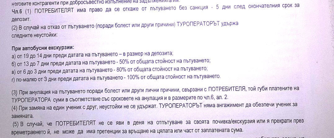 Това с примиряването е най-лесно. Имаш ли идея къде се виждат тези условия, за които са ти казали? В договора най-вероятно, който е подписан между туроператора и училището или се бъркам?