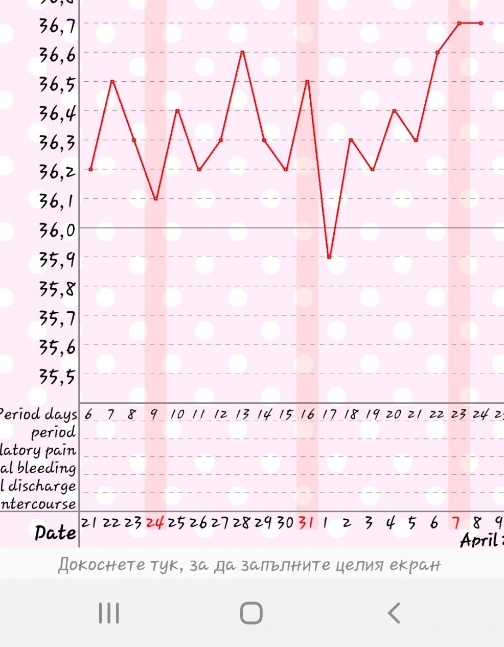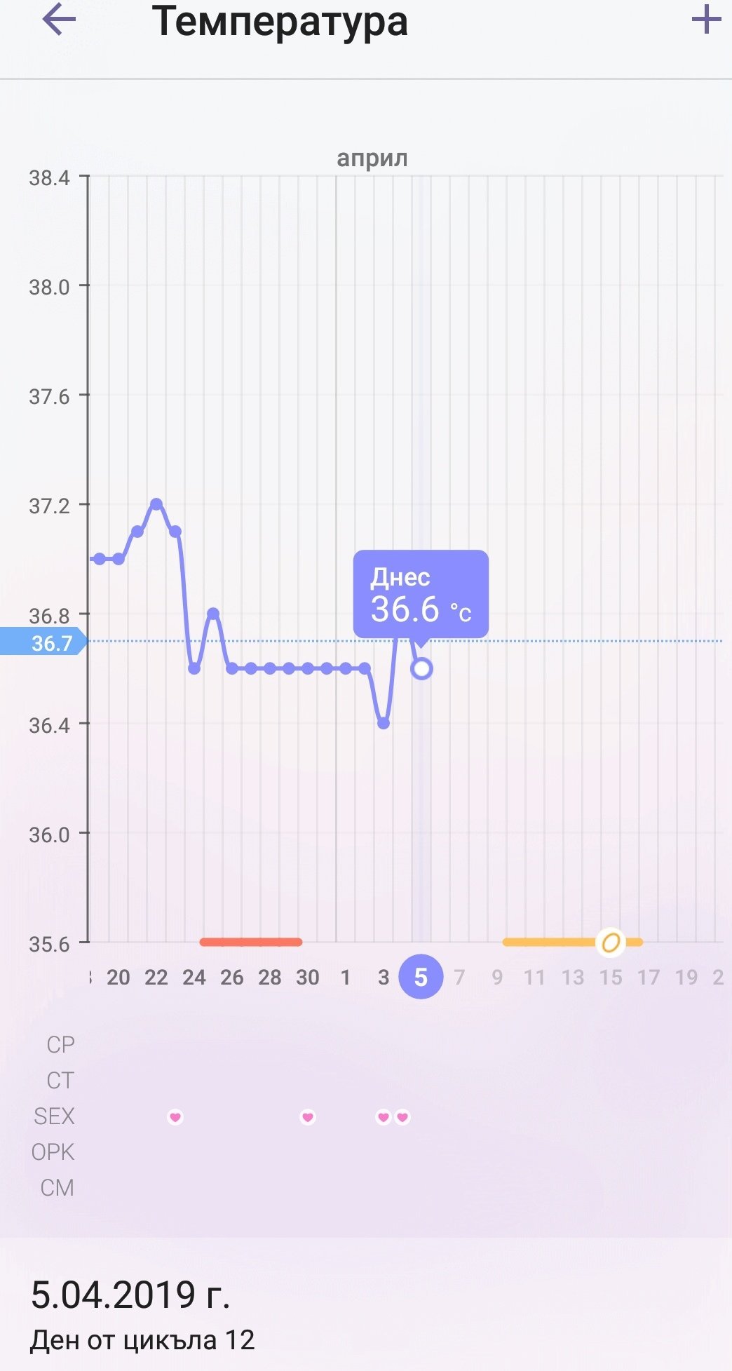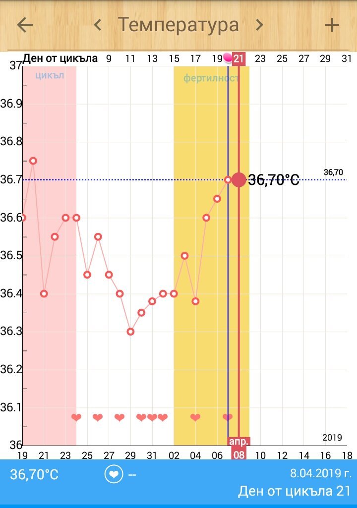 Здравейте момичета, може ли мнение и по моята графика. Цикъла ми варира от 28 до 31 дни. Меренето е анално с дигитален термометър около 07:10 часа. Правих и тестове за овулация, но за съжаление мисля че пропуснах важния ден Simple Smile на 06.04. На следващия 07.04 направих тест за ову и чертичката беше наситена, но не колкото контролната. Слуз имах на 05+06.04.