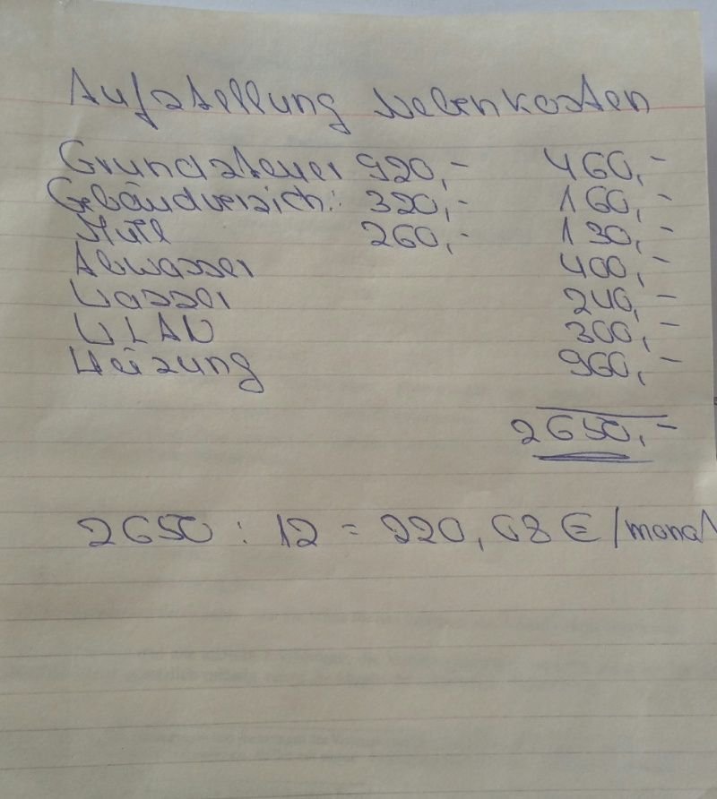 Ние живеем в къща от два етажа, като другият е необитаем, но все така принадлежи на хазяйката. В небенкостена ни влиза и водата освен всичко обичайно, хайцкостена е отделно, но общата сума е по-малка от гореописаната. Но това няма голямо значение, защото предвид изравняването, може би е по-добре месечните суми да са по-високи. Ток и интернет плащаме отделно по договори на наше име.