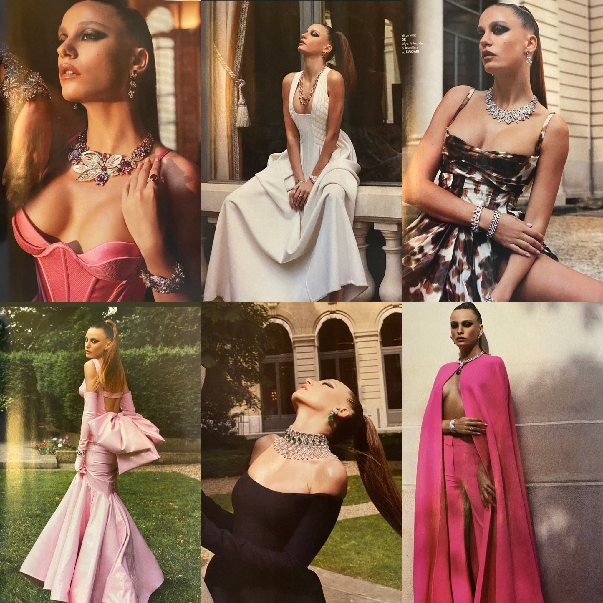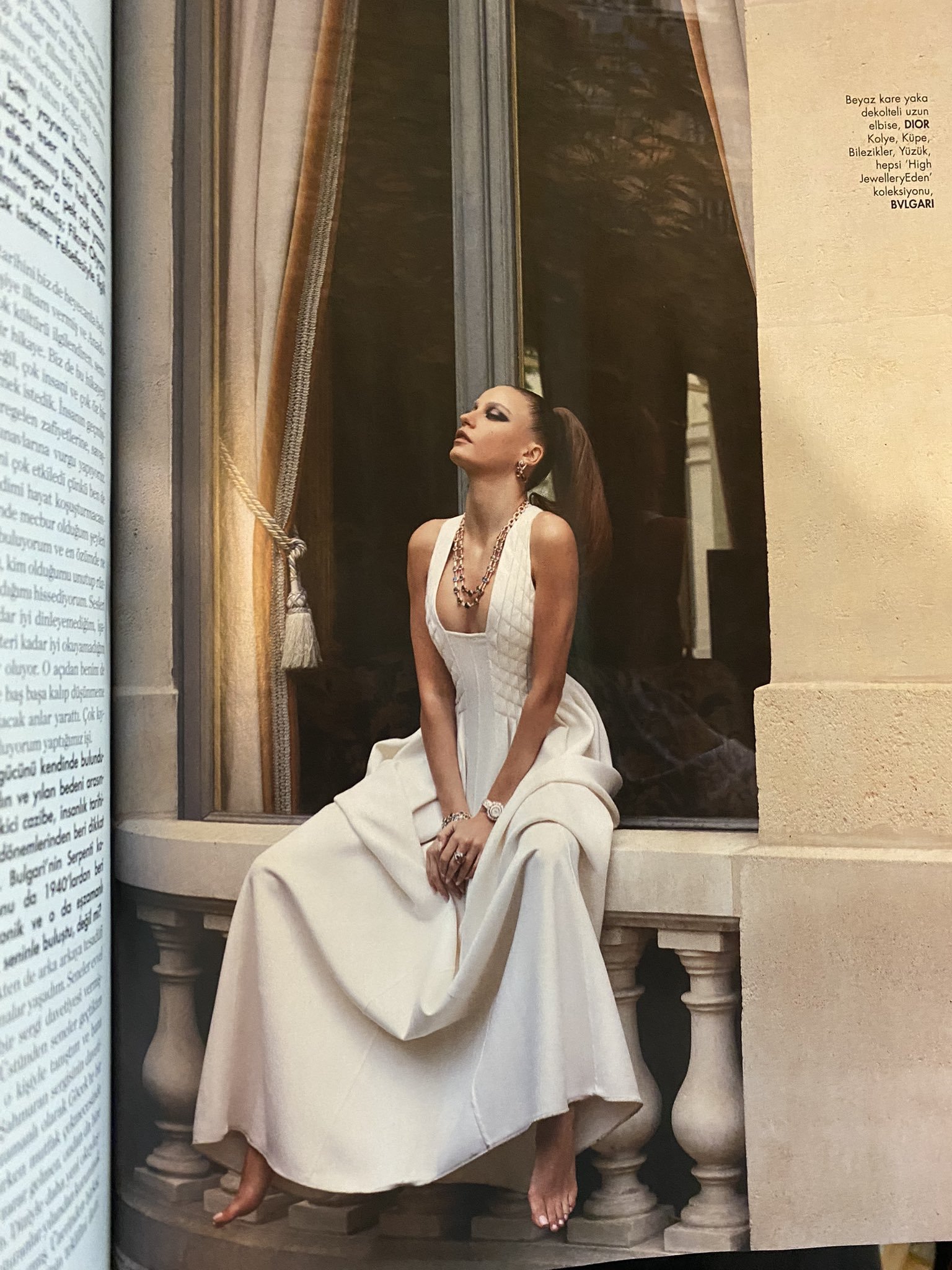 — У меня действительно были случайные открытия подряд. Много лет назад я получила приглашение на выставку. Спустя много лет я познакомилась с этим человеком и он сказал мне, что брошюра, которую мне дали, была приглашением на выставку Шахмаран. И снова в то же время, когда я была в фермерском доме друга в Гёджеке я нашла записку в кухонном шкафу, где было сказано «Скажи Шахмаран, что мы ей не навредим, пусть и она не вредит нам». Я тогда только согласилась на сериал. Оказывается, те, кто живет на природе, оставляют такие записки, чтобы защититься от змей. Прошло несколько недель и L’Appart передал мне предложение Bulgari. Будто открылась одна дверь и все мои пути превратились в символ змеи. Конечно, это животное, которое обычно я боюсь, которого прежде я ни разу не касалась и всегда избегала, но я верю, что оно принесло мне большую удачу. Это действительно стало поворотным моментом в моей жизни.