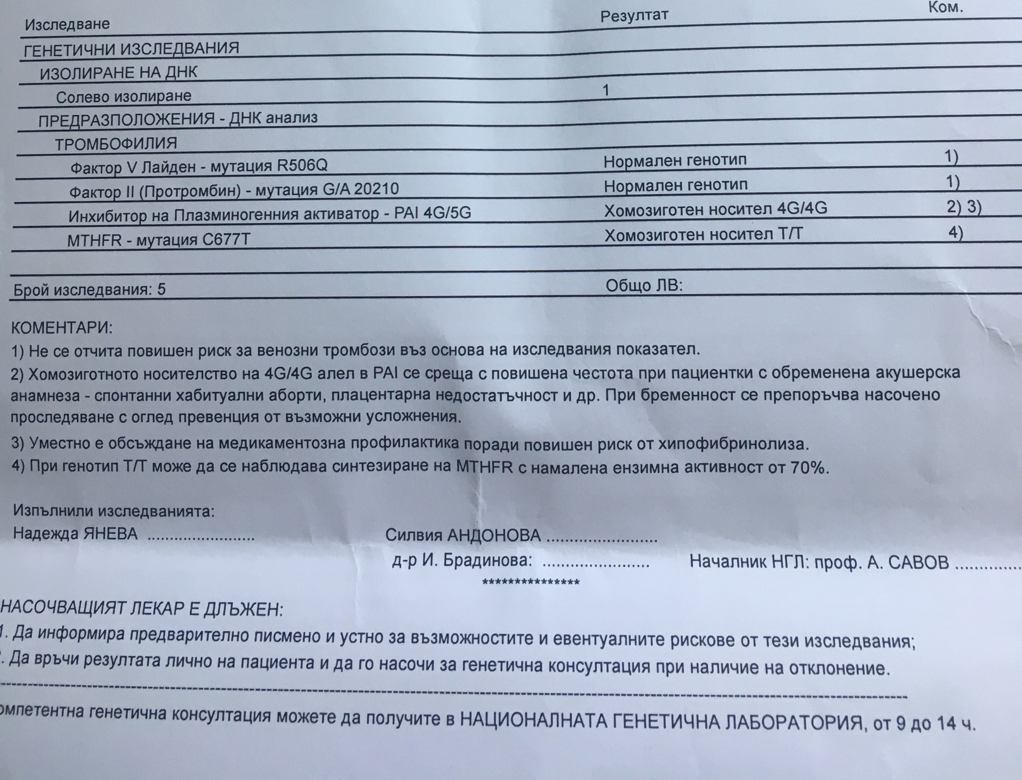 Здравейте момичета, бихте ли ми помогнали с разчитането? Разбрах от друга тема , че имам мутация в някой от гените, но все още ми е неясно. При това щях да започвам стимулация днес, но имам задържан фоликул и трябва да пия противозачатачни фемоден за 10 дни по 2 на ден. До сега не съм пила противозачатачни и не знам дали не са противопоказни при мен с тези гени. Ох, много съм объркана. Днес на прегледа в клиниката ме прегледа дежурния док.