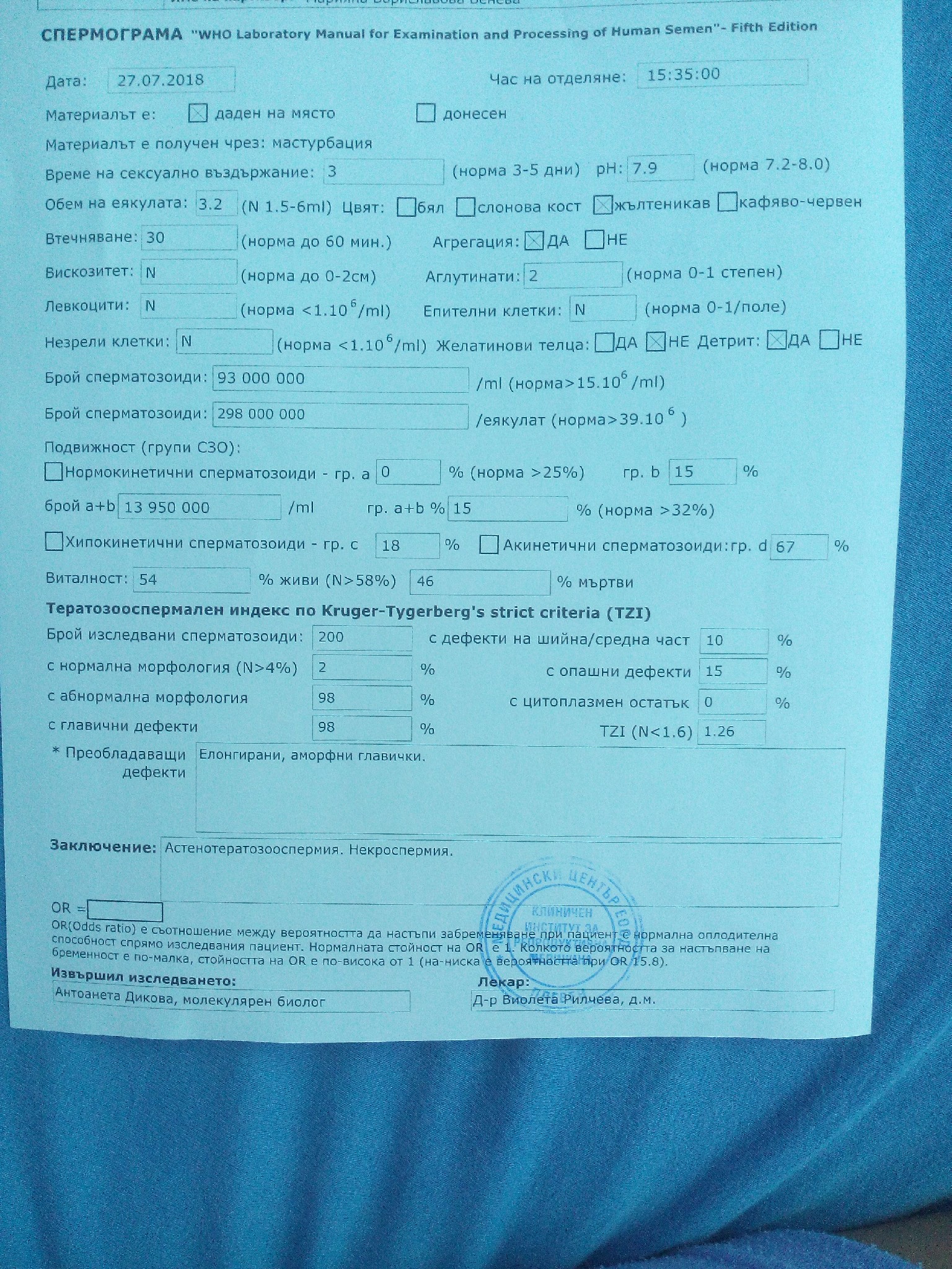 Аглутинатите са му малко завишени и не е зле да се направи и един тест за антиспермални антитела, които също може да са причина и за лошата подвижност.