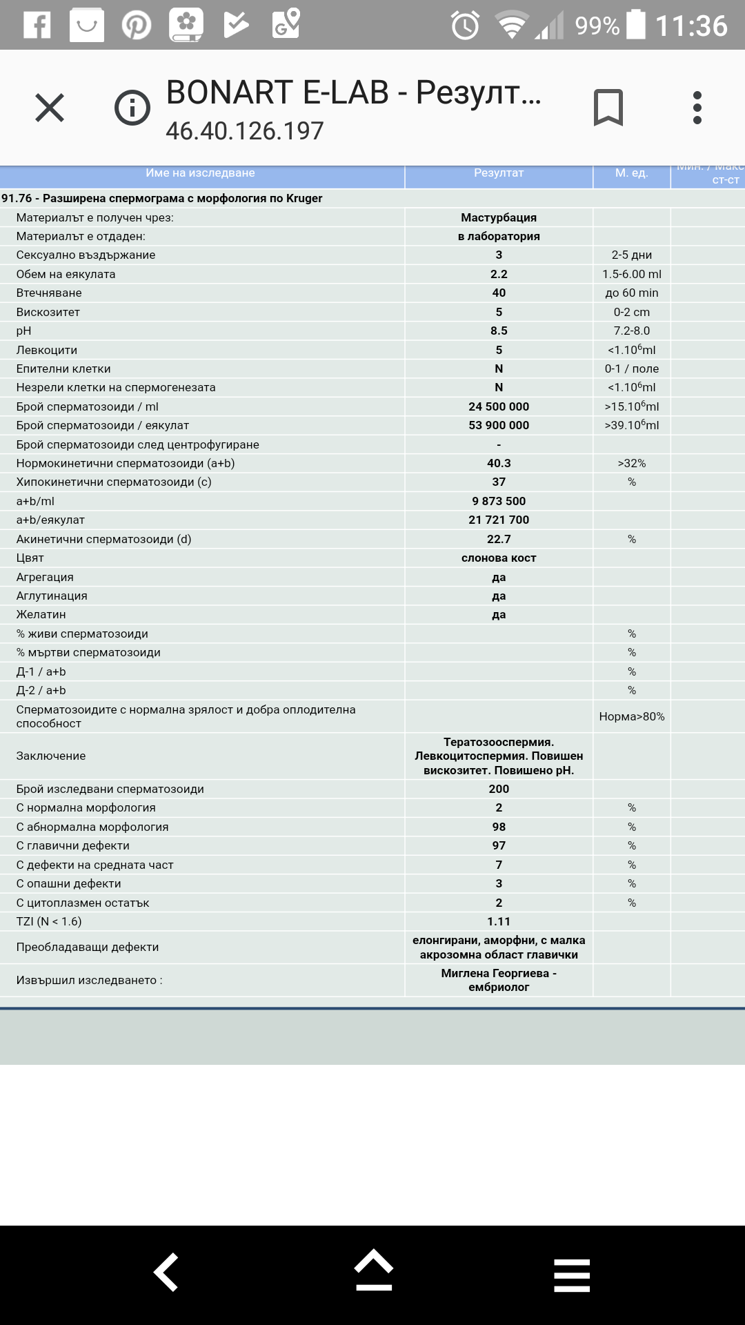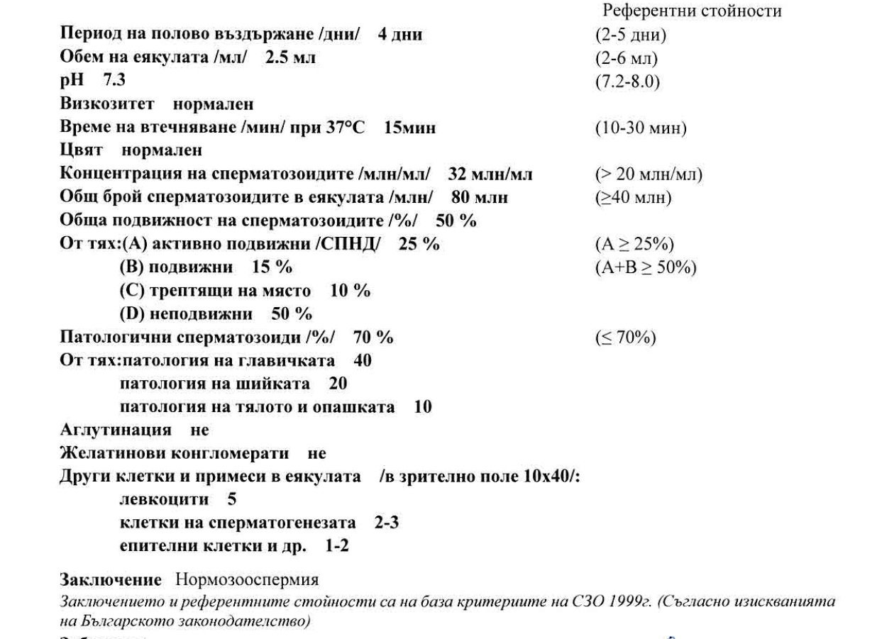 Реално погледнато ние правим опити от едва 6 месеца, аз съм с ПКЯ и по препоръка на моята гинеколожка пуснахме спермограмата за всеки случай. Тя ми каза, че иска да има задължително концентрация, подвижност и морфология и на база на тези изисквания е направена. Надявам се да е достатъчно за момента, но ще разбера чак края на другия месец като съм на преглед при нея.