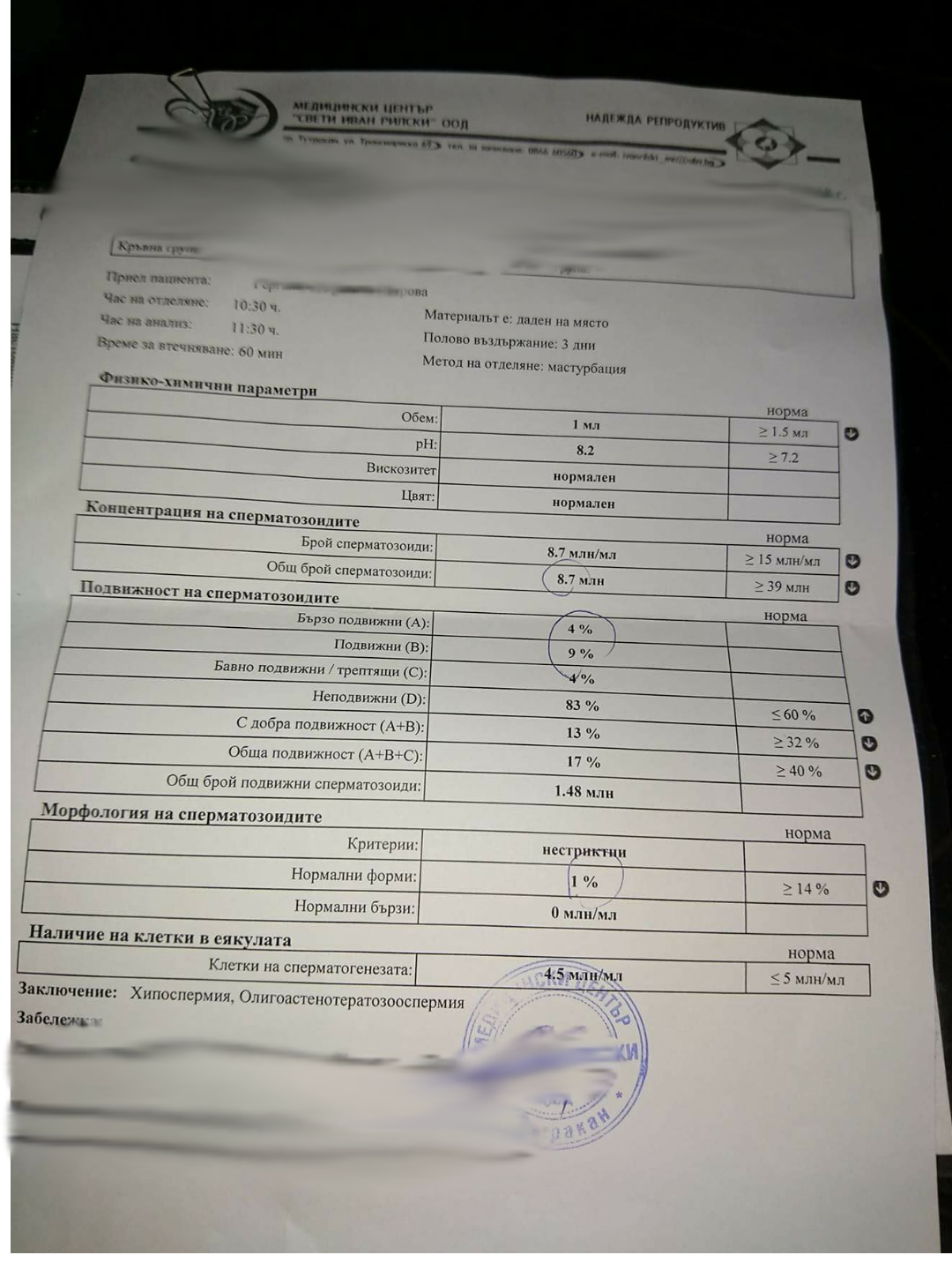 Отидохме в Надежда по спешност, защото дните на въздържание ставаха вече 7 и нямахме време, без да ни е изпратил лекуващ лекар и без да сме техен пациент. Просто вече ме беше страх и не знаех на кой да вярвам, но тази болница хора, е възможно най-малко комерсиална, убедих се сама. И какво да ви кажа: пак същото олигатотера .., но концентрация вече 38%, при референтна стойност по техните стандарти 39%, т.е. само 1% под нормата.