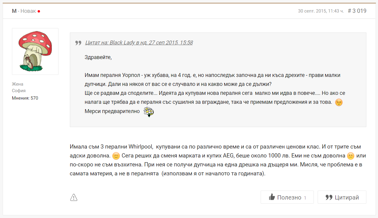 hahaha един пример от преди 3г. Дооообре! много предствителна извадка. Освен това, в оплакването се говори за една дупка, в една дреха - за мен това не е лошо качество на пералнята, нито повод да се определи, че цялата марка прави дупки по дрехите. Още ще си измучеш ли от пръстите да копираш или продължаваш с рекламата на горение?
