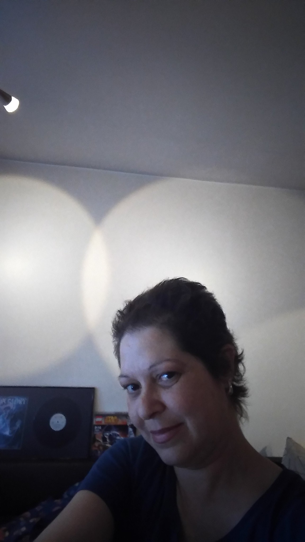 Май зависи от химията, аз имах само три червени в схема там няква с Ендоксан, после почнаха да ми вливат само Доцетаксел, от който да ви кажа честно сякаш по-гадно се чувствах, та затова все съм коментирала тук, че не първите червени ме сгазиха като усещания, а баш четвъртата, т.е. първото доцетакселче. Иначе от кое точно капе косата така и не успях да разбера, май от червената химия. По Нова Година нямах абсолютно никакво окосмяване, ни коса, ни вежди, ни мигли, косъм не беше останал по тялото ми. Рисувах вежди, лепих мигли, надявах перуки само и само хората около мен да се не шашкат, че бях заприличала на Фестър Адамс. После почна един мъх, който два пъти окастрих, щото нещо не ми понасяше визията на смешно бебе маймун, предпочитах да съм си зловеща, като усетих обаче, че вече същинска коса никне я оставих и... срам не срам, ще си позволя лицето си да разкрия... ей туй селфи го метнах преди малко след работен ден и над 8 часа сплескана нова коса от перуката, без пяни, без гелове, ей такова едно е в момента положението. Бих казала обнадеждаващо, даже си се и харесвам. Нищо, че в момента това чудо на никаква фризура не подлежи