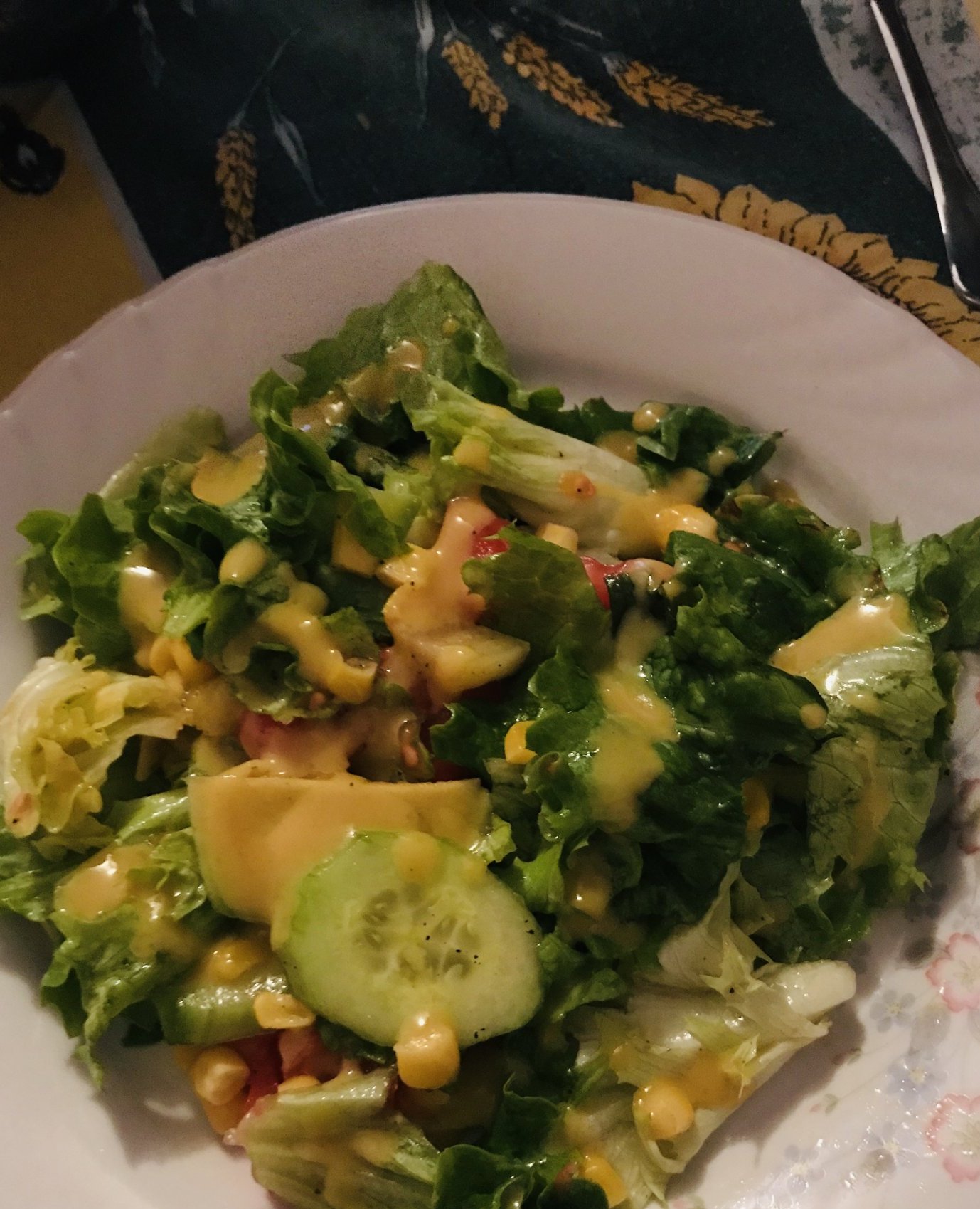 Маруля, краставица, домати, царевица, ананас, авокадо и сос от горчица, мед к лимон.