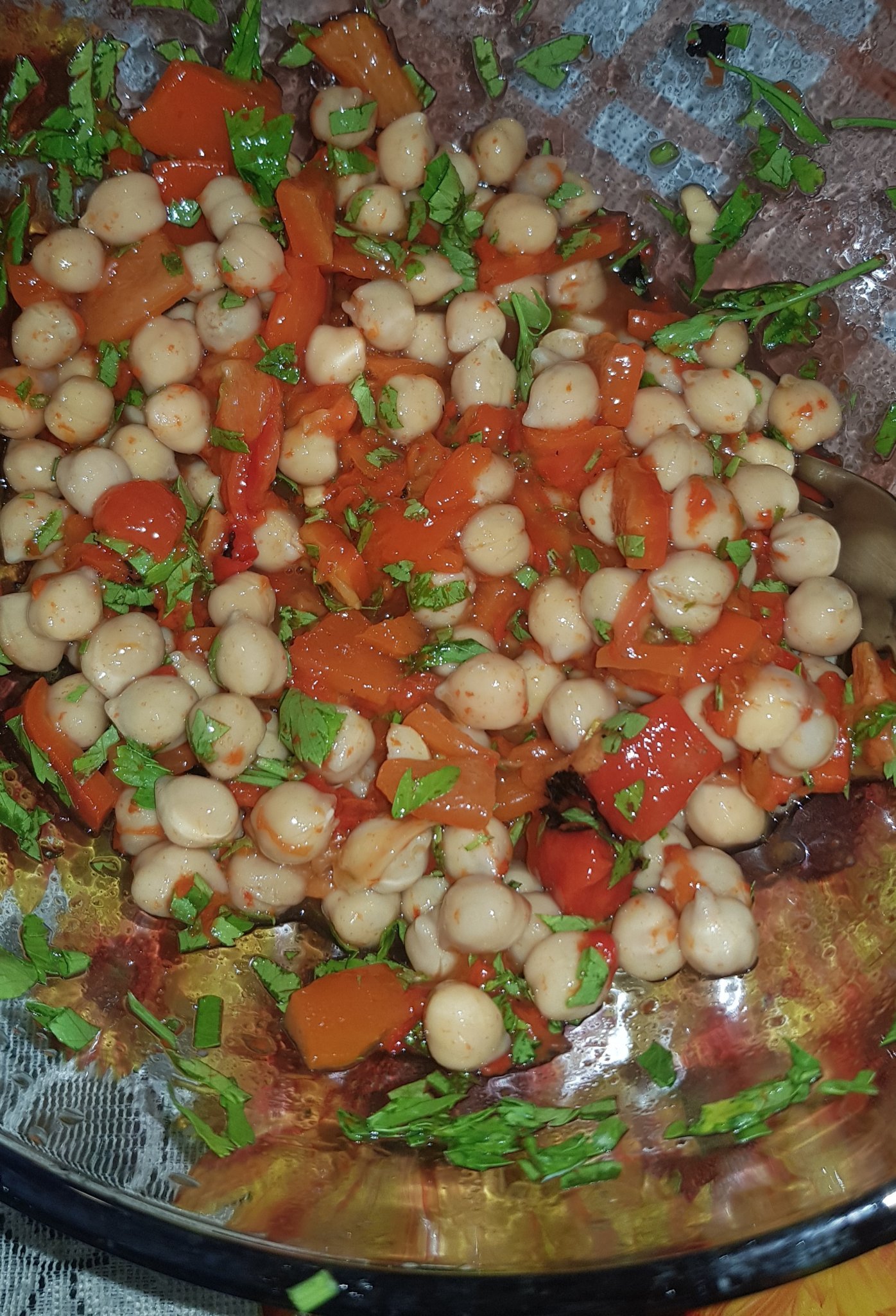 И една салата с нахут , червени чушки , лайм , магданоз и зехтин