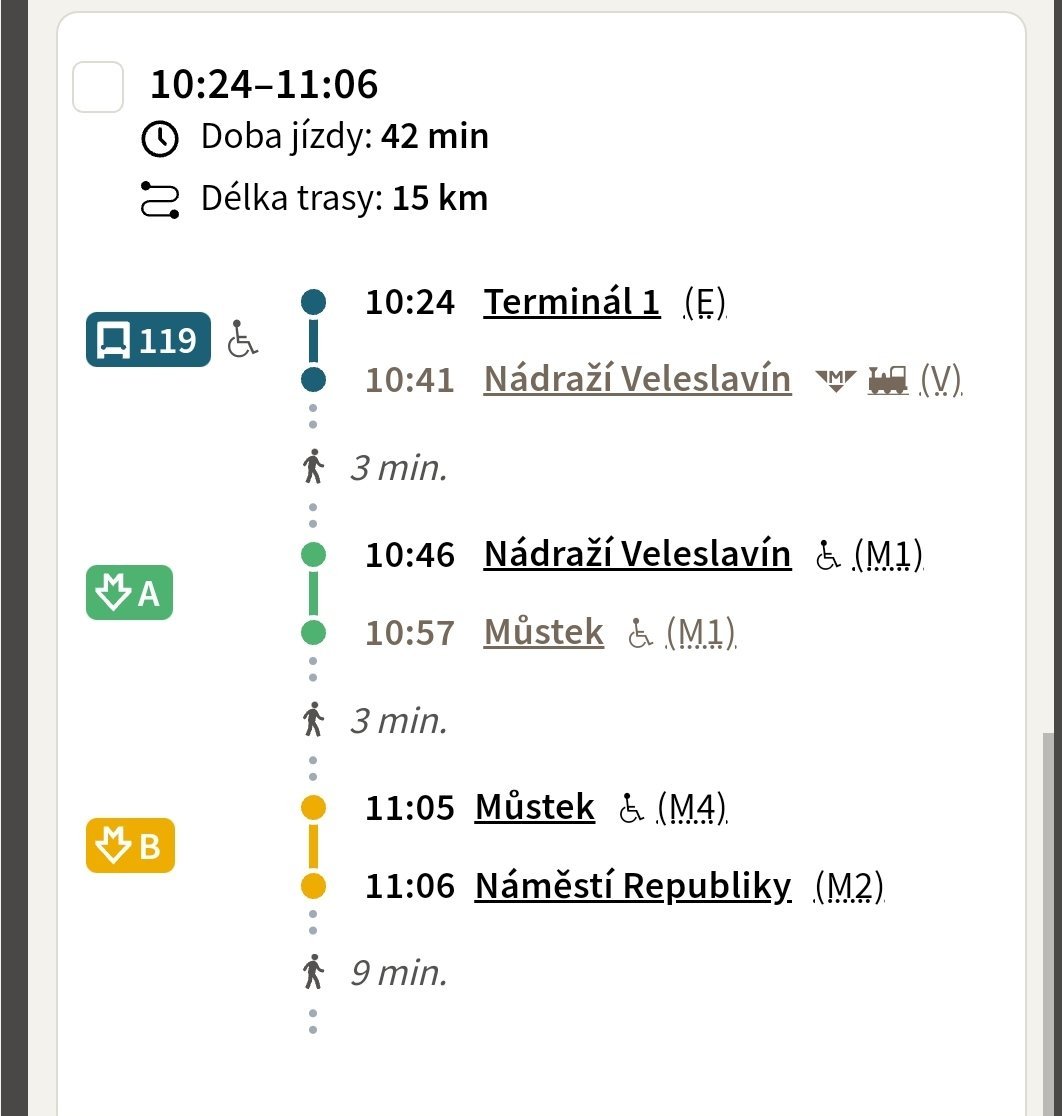 На този сайт https://www.dpp.cz/en ако пишеш в полетата Terminal 1 и Masna 20 ще ти даде всички варианти с времетраене и колко минути пеш е. Само си нагласи примерен час на пристигане, за да е актуално и да не ти дава вечерни варианти. Ето един примерно: