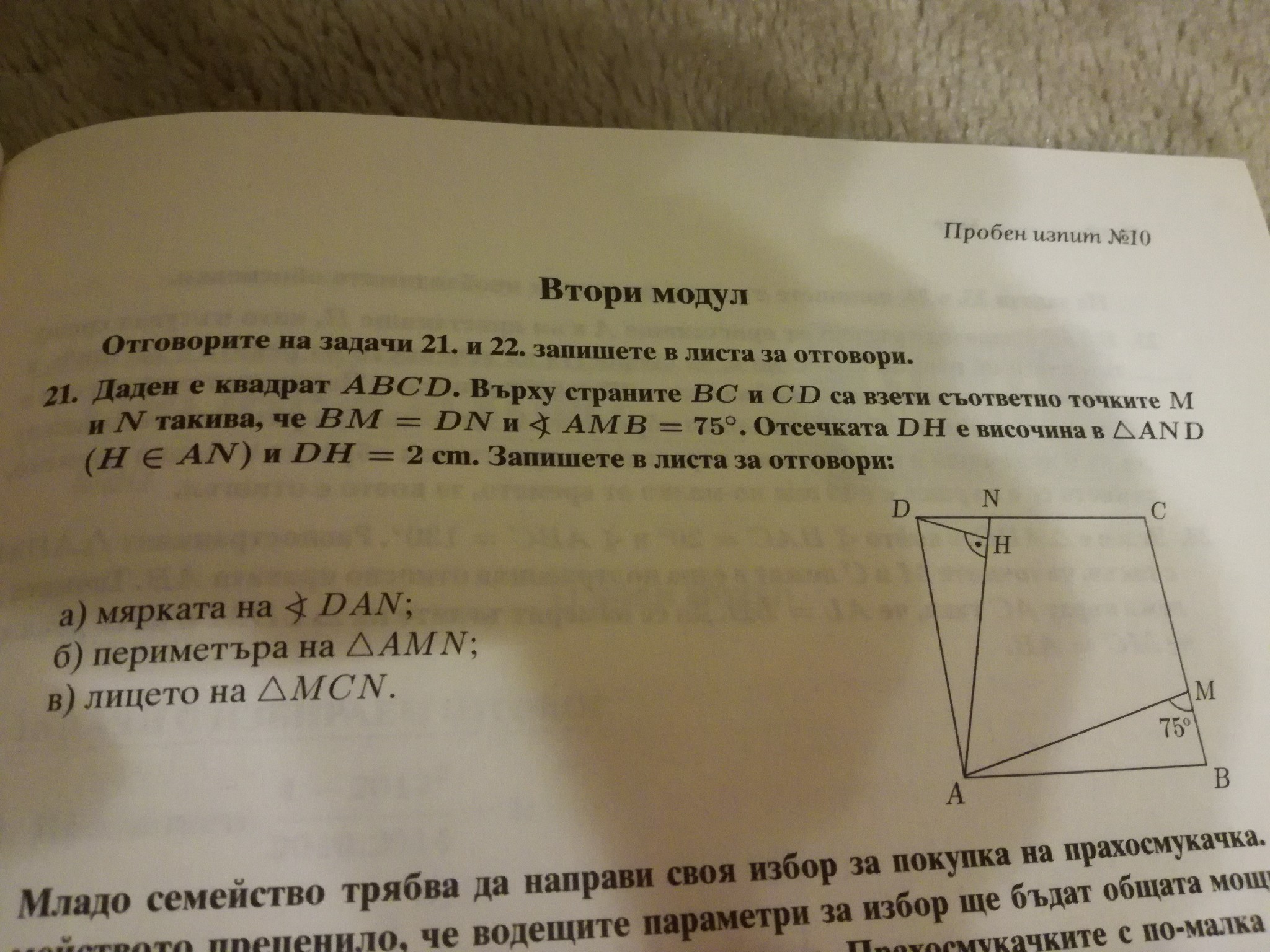 Триъгълниците ADN и ABM са еднакви по 4-ти признак. От това следва, че AN = MN и триъгълник AMN е равнобедрен. Ъгъл AMB = DNA като съотв. ел в еднакви триъгълници, следователно ъгъл DNA е 75 градуса. Получаваме ъгъл DAN = 15 градуса от сбора на ъглите в триъгълник DNA. По теоремата за правоъгълен триъгълник с ъгъл 15 градуса следва, че височината е 1/4 от хипотенузата, следователно AN = 8 см и AM = 8 см, защото триъгълникът е равнобедрен. В триъгълник AMB ъгъл MAB също е 15 градуса. Ъгъл A е 90 градуса, следователно ъгъл MAN = 60 градуса (защото сборът на ъгъл DAN и BAM е 30 градуса). Получаваме, че триъгълник AMN е равнобедрен с ъгъл 60 градуса, следователно периметърът му е 3.8 = 24 см.