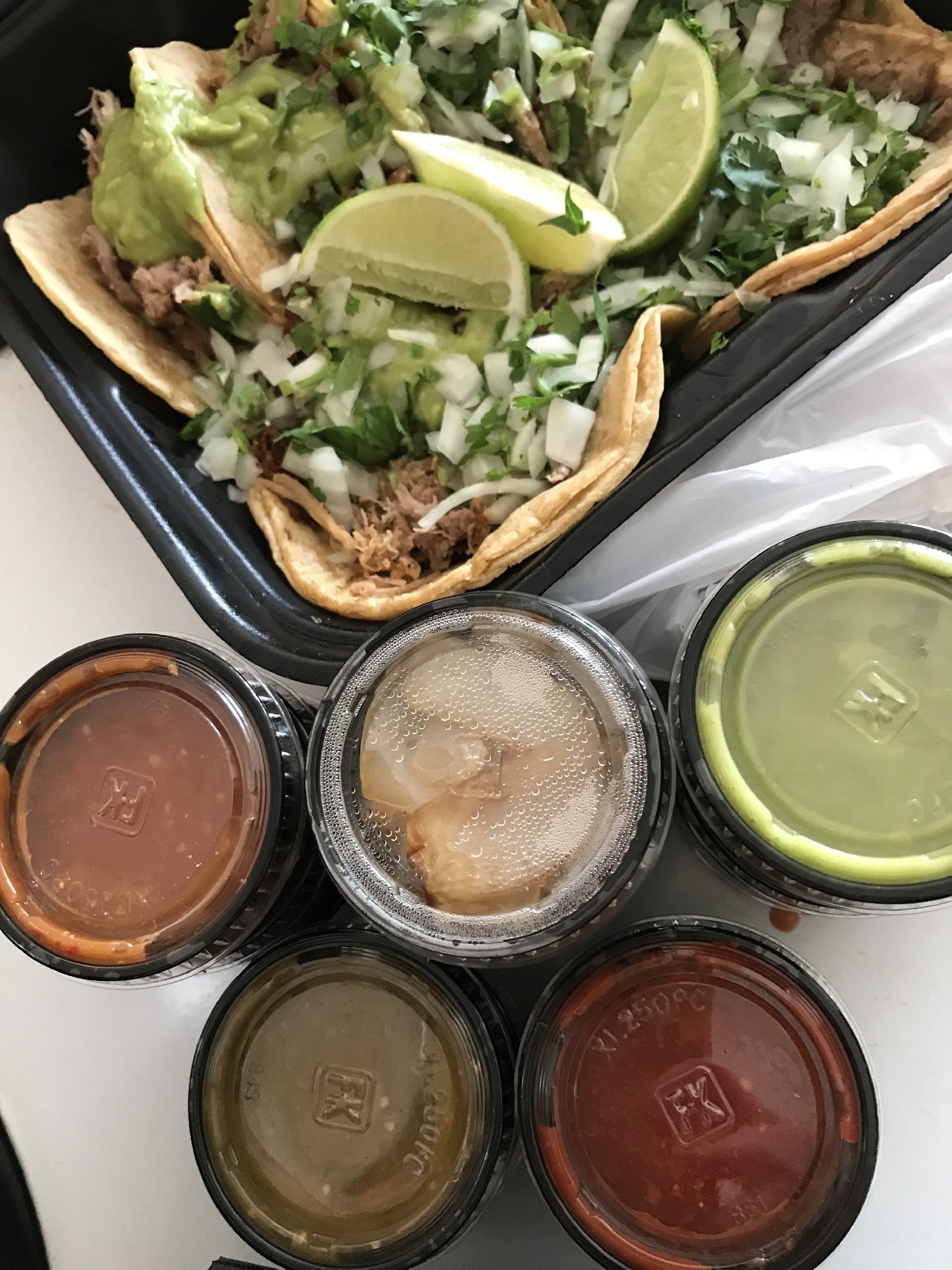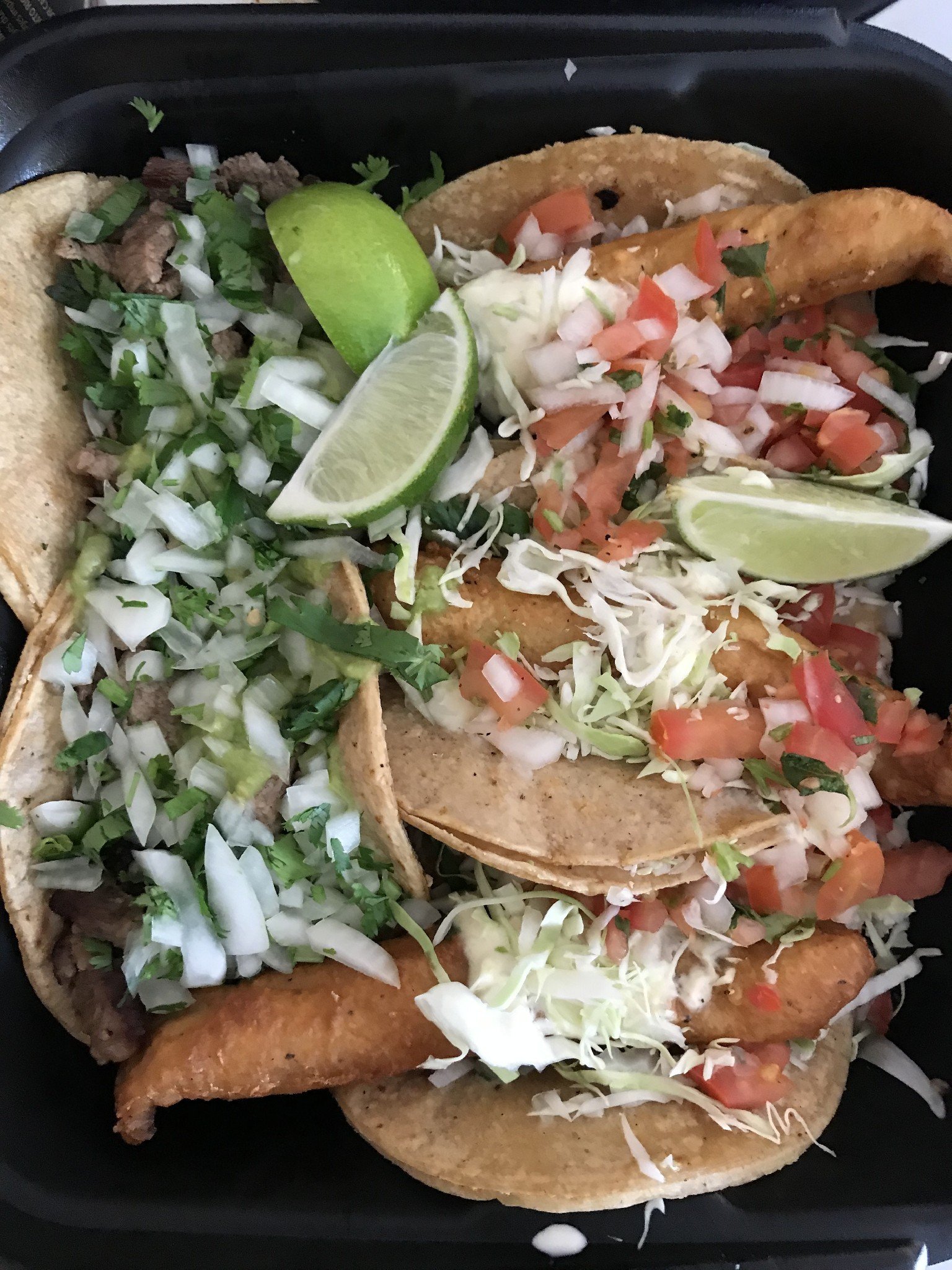 И по случай остаряването ми днес, решихме да се поглезим с мексикански такос - рибни, с телешко и със свинско; и много различни салци.