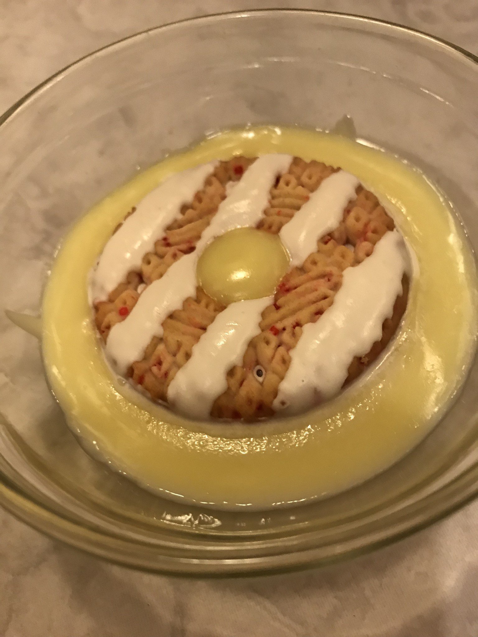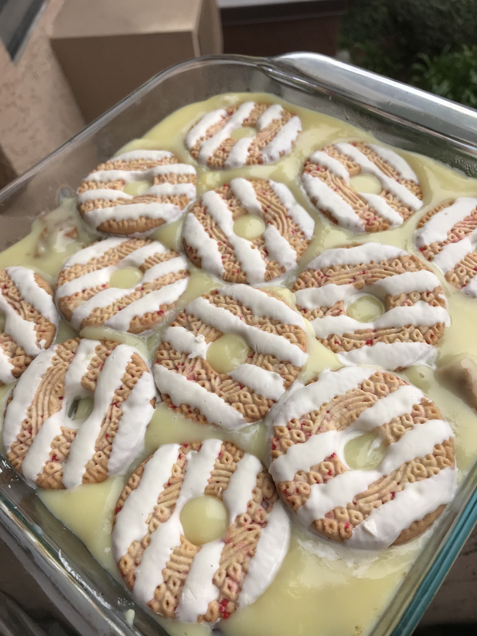 Не ме карай да се чувствам неудобно  😕. Обирам шкафовете преди да си тръгнем за България и използвам всички сладки наличности 😜. Кремът е от пудингите на Др. Йоткер - Ванилия с мляко. Вътре съм сложила и сушени червени боровинки и стафиди. Това е.