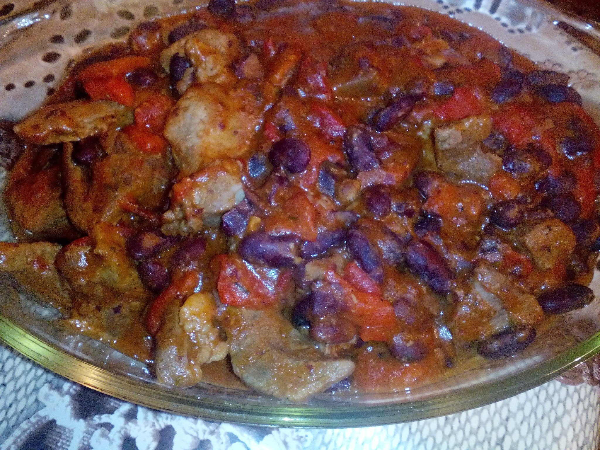Една "изгъзица" за вечеря. Трябваше да е само пържени свински хапки, но в последния момент реших да добавя печени чушки, червен боб от консерва и доматен сос. Получи се вкусно.