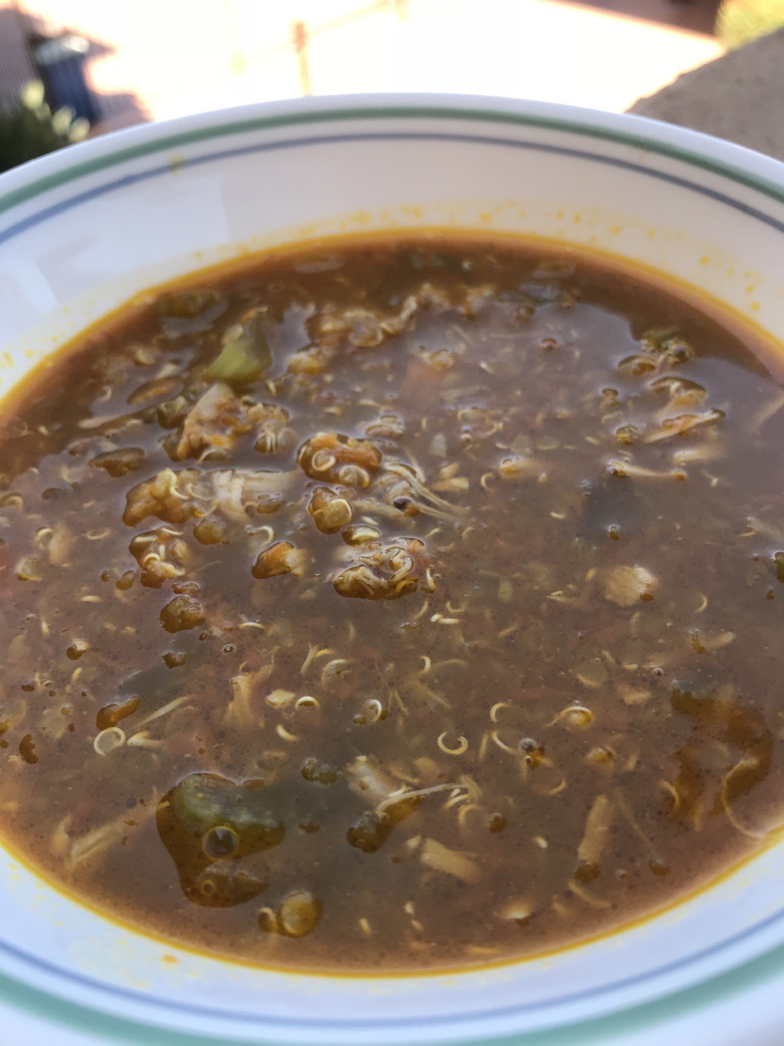 Супа киноа, телешко и бульон; пилешко месо със зеленчуци на тиган и ориз с масло.