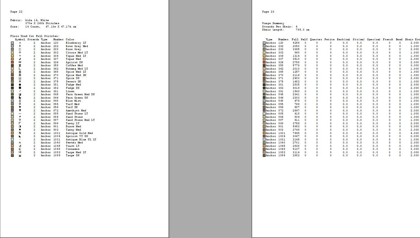 dimitarsavov, водейки се по табличката от nelka.nelka, пресмятям, че 6 чилета по 8м ще са ти добре. На конците Madeira обаче чилетата са по 10м. Така че зависи с какви ще изпълниш схемата. Също и как шиеш, правиш ли големи протягания между местата където се шие с даден цвят, изобщо всеки си има маниер, и от там - зависи колко фира или резерва да си предвидиш. Няма толкова големи разлики в цветовете по партиди на конците, че да не е възможно да си докупиш едно чиле ако недостигне. Коментирам само по табличката понеже не работя с програми и не вярвам на пренабори. Ако искаш помощ по превода от английски, пиши. И, разбира се сме любопитни как върви, показвай.