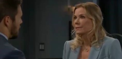 Брук: „Говорих с Ерик и разбрах, че Зоуи е била наета отново.“ Ридж: „Да, това е вярно.“ Брук: „Как можа да допуснеш тази лъжкиня обратно във ФК?“