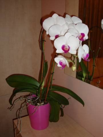 Бялата е при мен от м. Юли 2007 г. В началото беше с 3 цветоноса. След около 10-на дни опадаха всички цветове и пъпки. След това 3 месеца беше "заспала". Почти се бях отчаяла, когато ме зарадва с листо! Оттогава до сега цъфти непрекъснато. Пусна 2 нови цветоноса, но пък 2 от старите изсъхнаха. Листата й са с хубав зелен цвят, лъскави и твърди. Подземните корени са дебели, а има и много въздушни корени. Никога не отрязвам целите цветоноси, само отрязвам около 10-на см. от края.