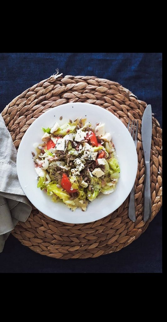 Салата за обяд: айсбер, домат, риба тон, синьо сирене, слънчогл.семки, чия,зехтин