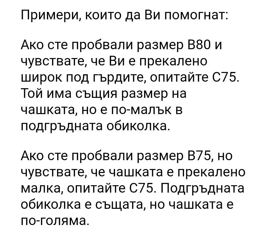 Пробвай с 80А. Трябва чашката да е същата като на 75B. Същата чашка трябва да е и на 70C. Разликата е в обиколката под бюста.