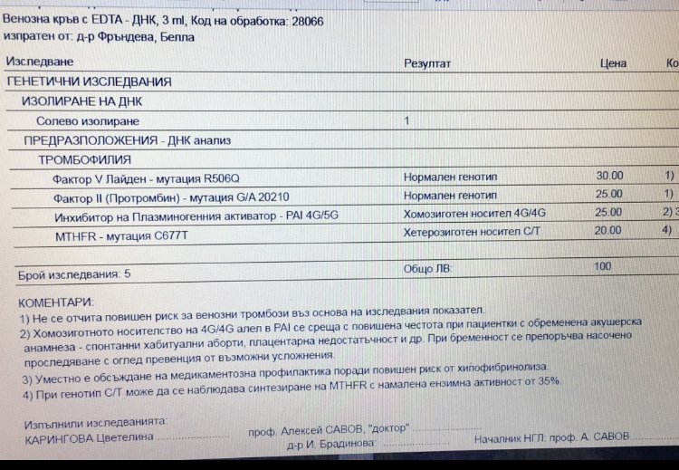 Tella, според мен имаш по една хетерозиготна мутация по двата различни фактора на MTHFR, плюс хомозигот по PAI.
