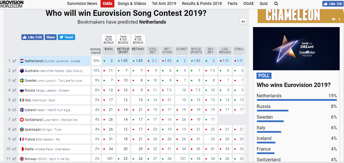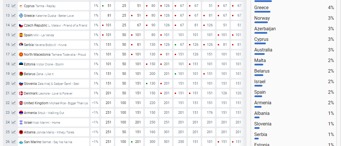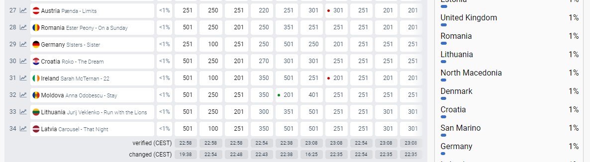 Обновиха залозите. Холандия се изкачи (в проценти, не е мърдала от първото място откакто излезе), Швеция и Австралия се въртят за второто място, а на дъното са Сан Марино и Германия.
