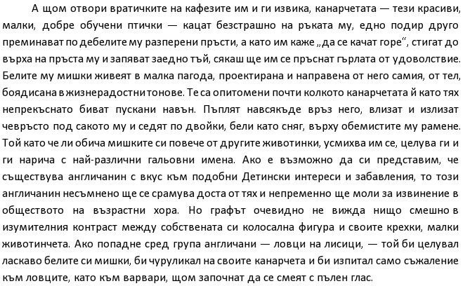 "Лицето му беше червено от гняв, а в едната си ръка държеше стара прашна обувка. Той бе така вбесен, че езикът му се беше вързал и когато речта му се възвърна, заговори с такъв груб американски акцент, какъвто не бяхме забелязали у него сутринта.