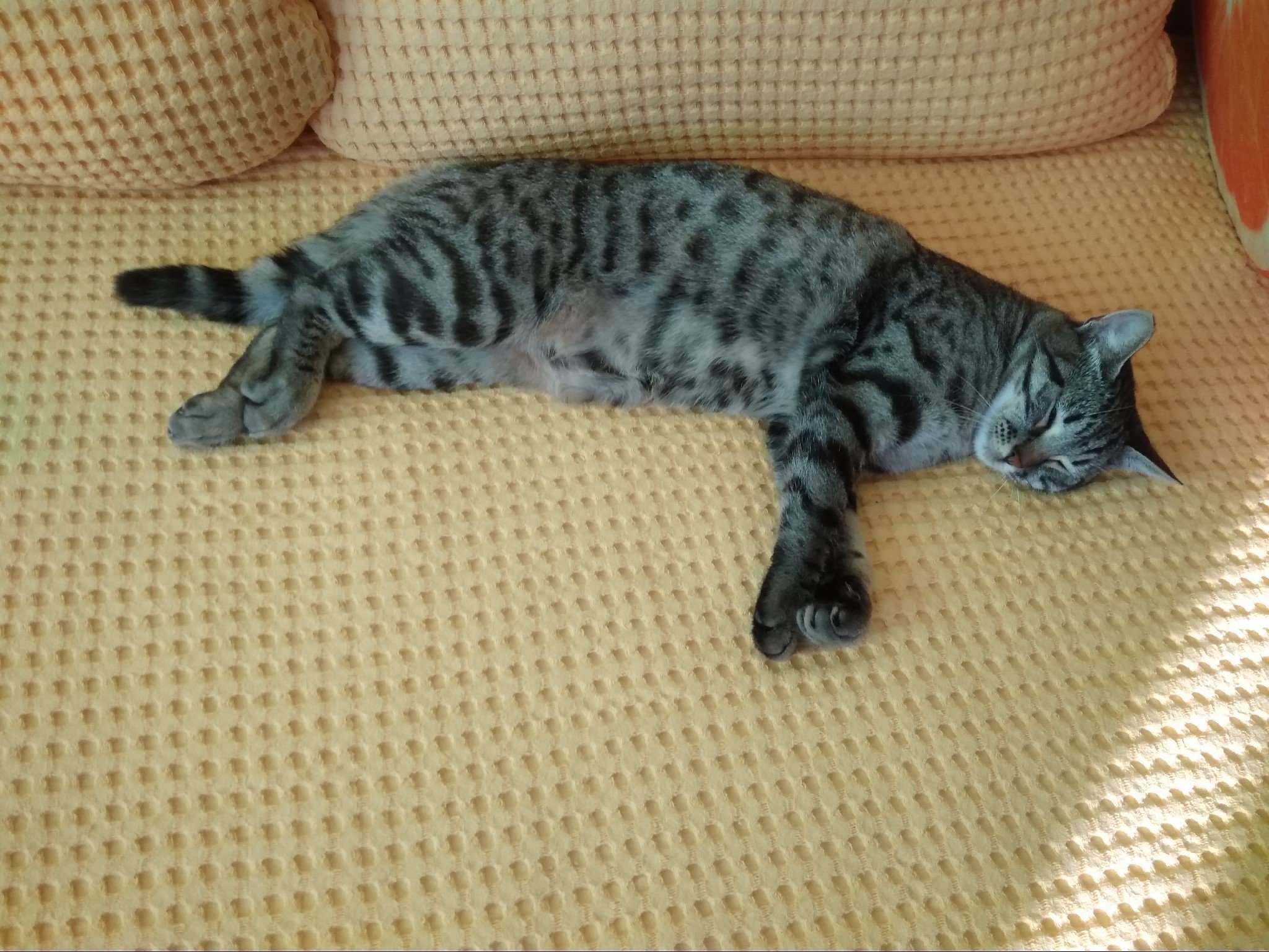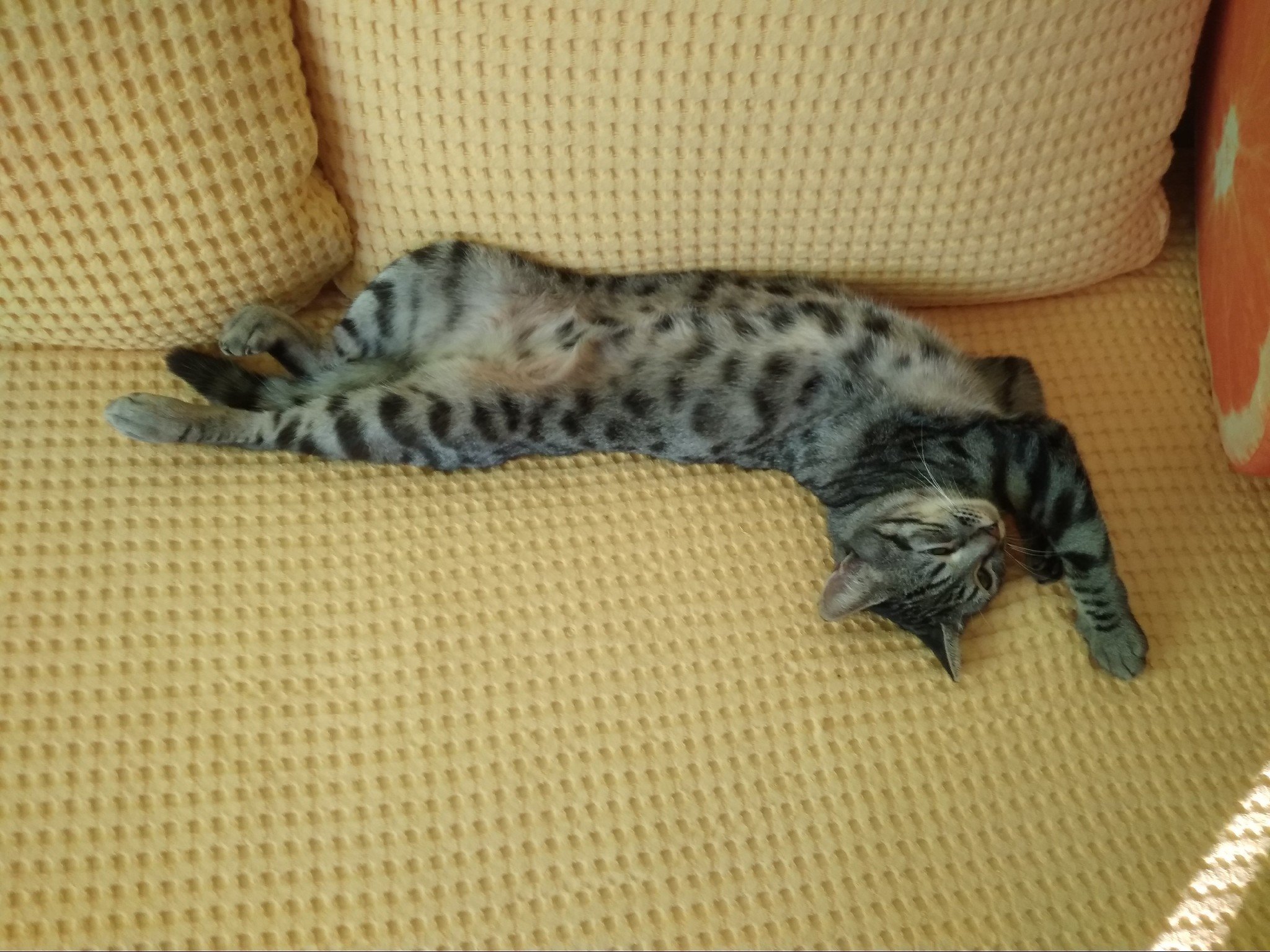 Елза тази сутрин за пръв път успя да си отвори вратата на детската стая. Досега все спалнята си отваря и затова сложихме райбер, че нощем отваряме прозорците и ни е страх да не скокне навън. В детската също отваряме прозорец, но вратата се отваря по-трудно и до момента не й се отдаваше тази работа, затова все още няма райбер на вратата. Но сутринта в 6 ч се започна едно скачане и дране по вратата и накрая успя да си я отвори. Влезе вътре, направи едно победоносно кръгче, след което се врътна, отиде в хола и си легна върху своята част от дивана (има си постлано да й е меко и комфортно).