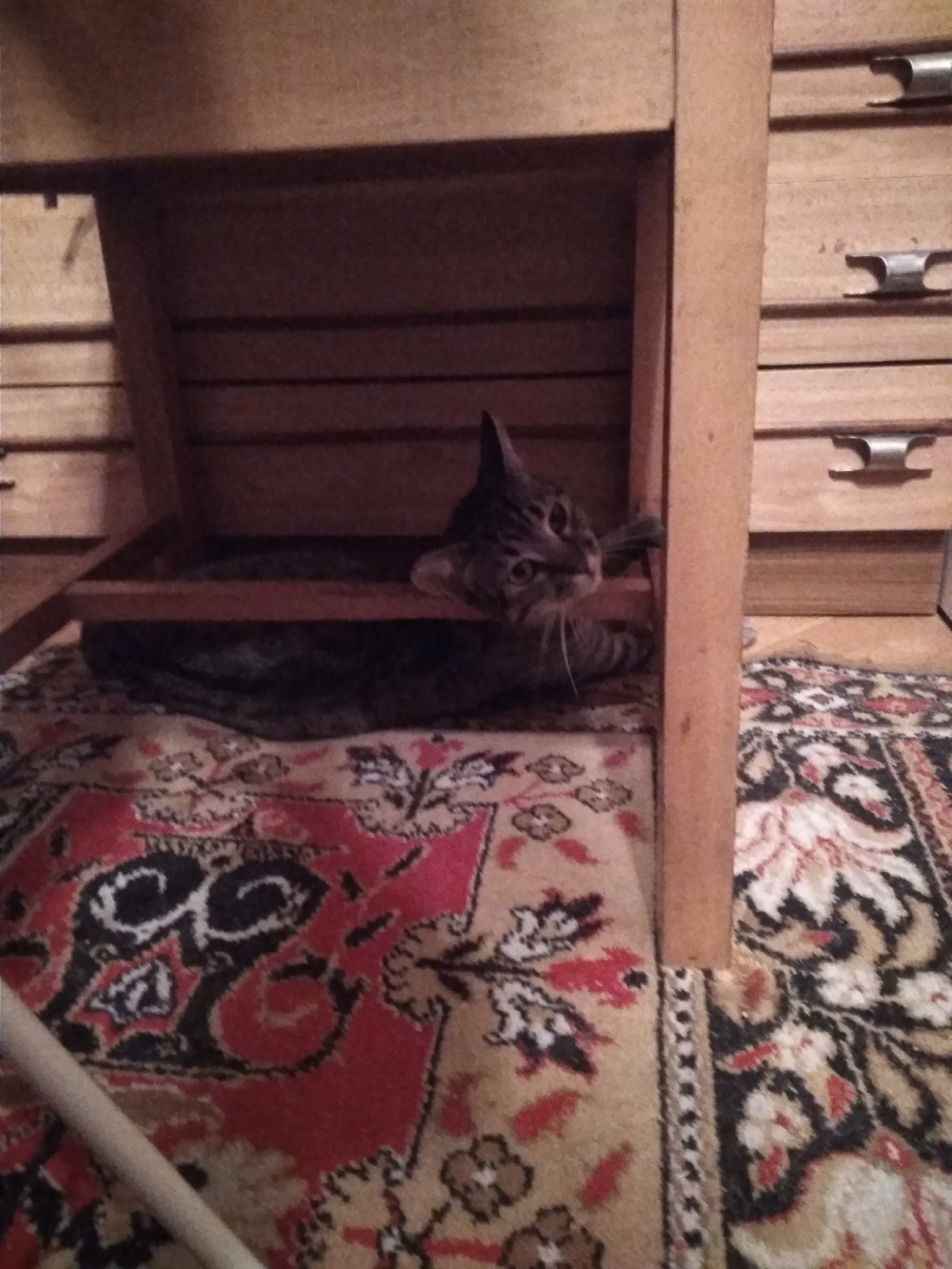 Не става, хаха! Само щом мръдна, се изпарява на секундата. Засега само ми позволява да говоря, и ми отговаря с едно пискливо ''мяуууууу''. Но и главата да си мръдна, значи отивам да го изям, и изчезва. Трябва му време, за да се убеди, че съм нахранена и по случайност не ми се яде котешко точно днес.