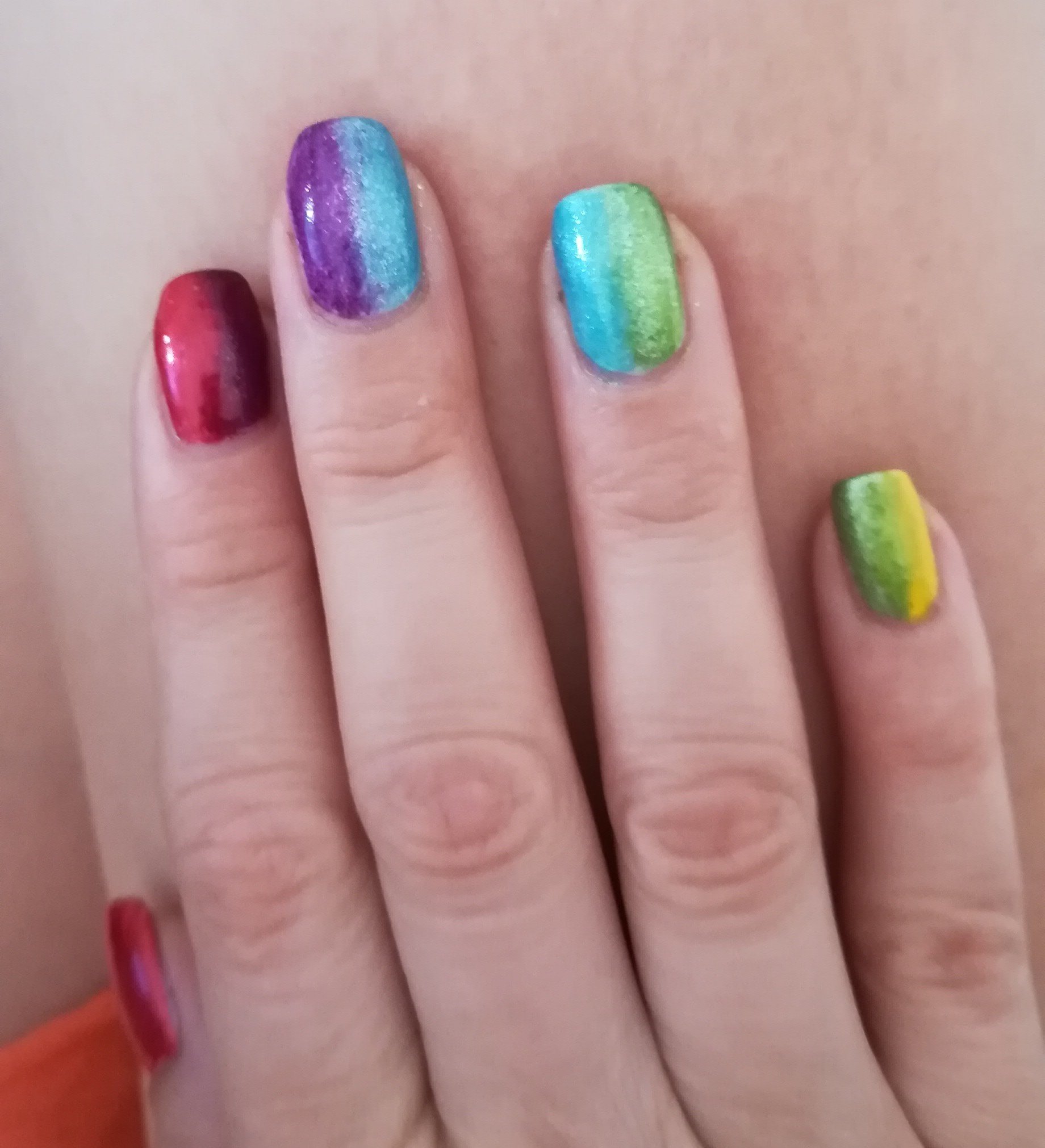 Лятото обичам да съм шарена, а и малката много се радва. Simple Smile Тоя маникюр го видях преди години в youtube. Ето линк: