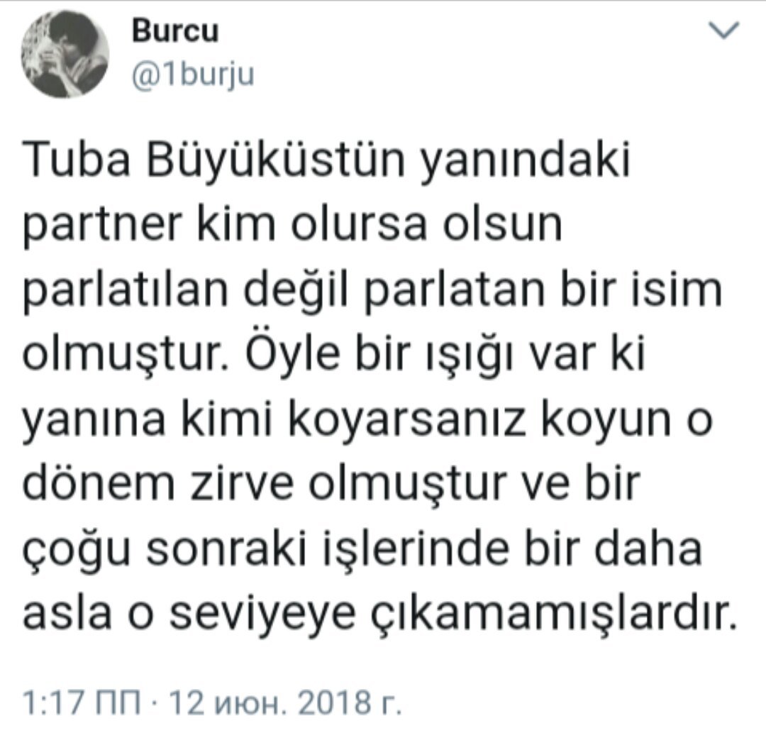 Независимо от того, кто бы ни был, партнёром #TubaBüyüküstün она отпалирует любого не полированного. В ней есть такой свет, что если вы ставите с ней кого то, то он достигает такого наивысшего уровня, до которого ему больше не добраться, в своем следующем проекте.