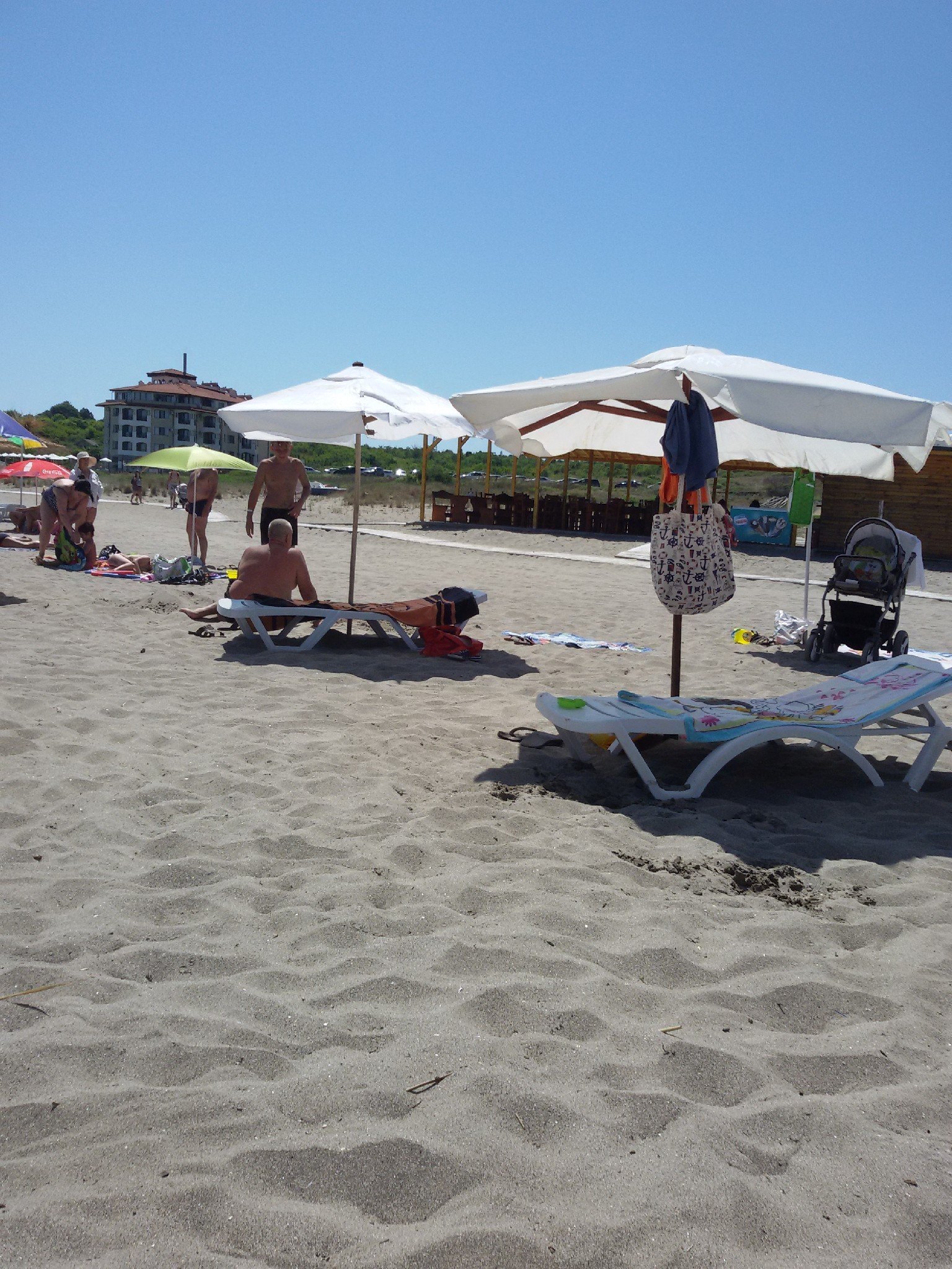 Имат си чадъри пред хотела на басейна и можеш само да отиваш да се къпеш в морето. Паркингът се вижда от дясно на хотела на едната снимка. Пълен е с коли и явно и хотела е пълен. Във Визит вече има отзиви от предходната седмица и са добри.