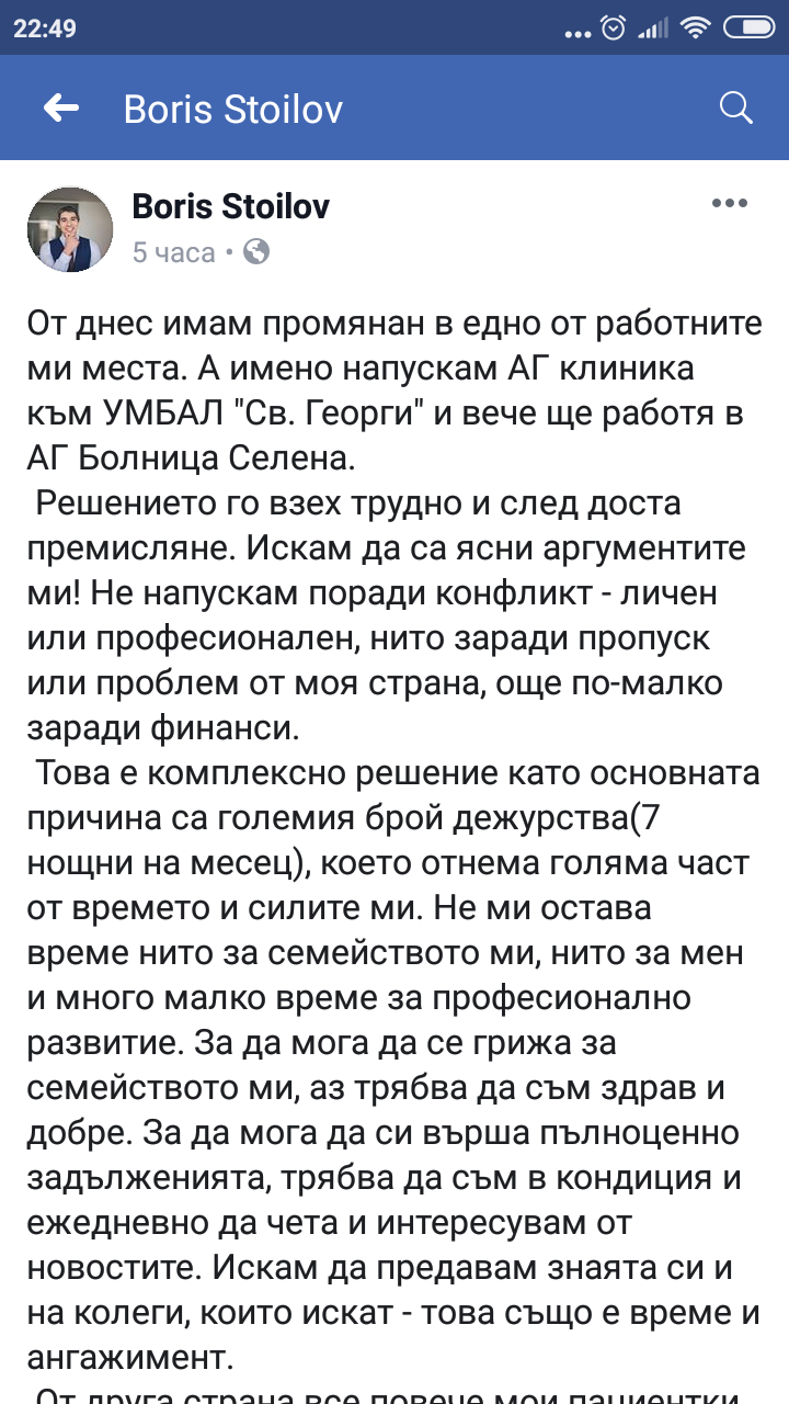От днес д-р Борис Стоилов работи в Селена, напуснал е Св.Георги.
