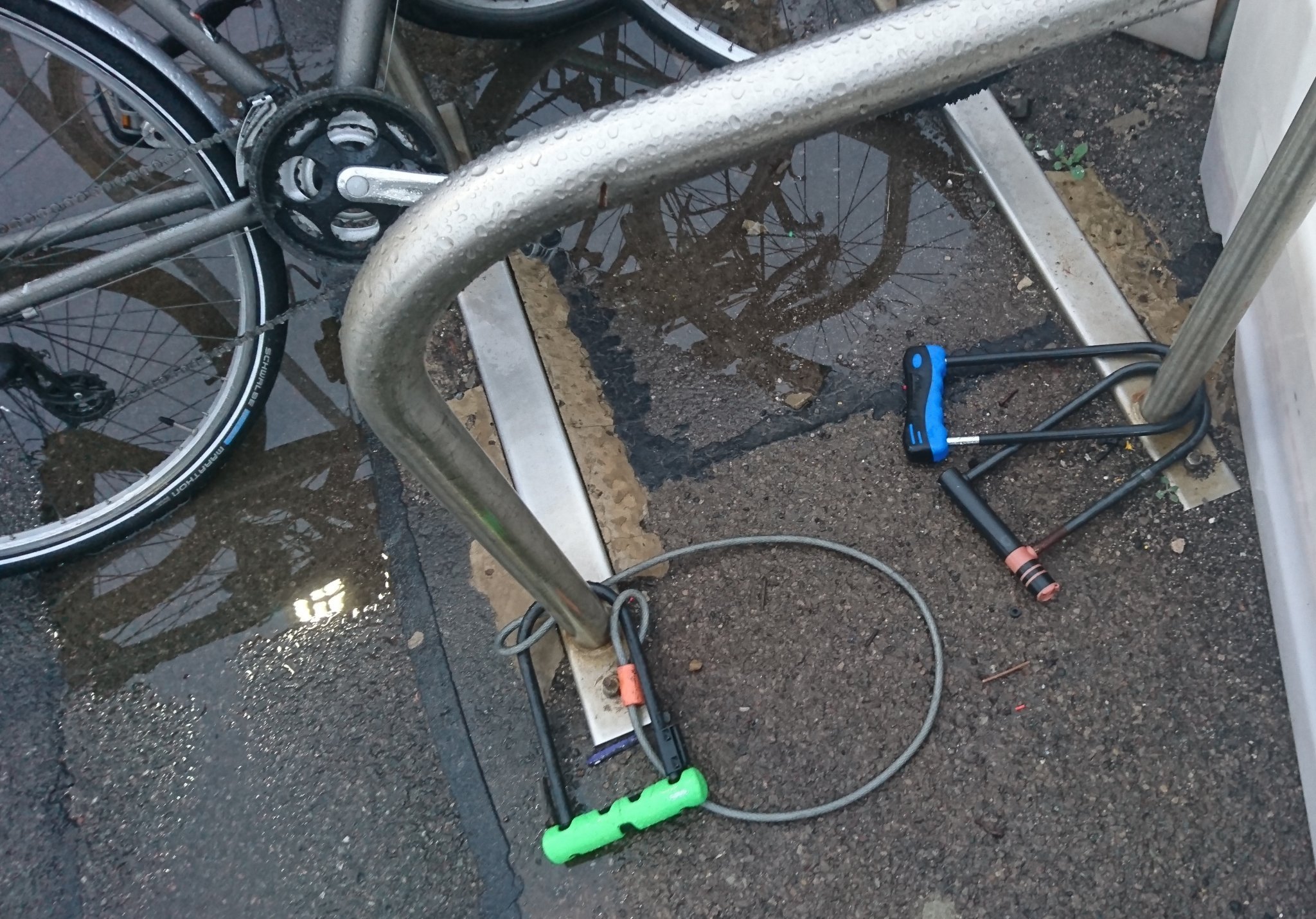 Ето ги D locks за които споменах. На моята гара обикновено по един макс два да оставят на едно място, тук три са наредени, трима собственици, който пръв свари 😂