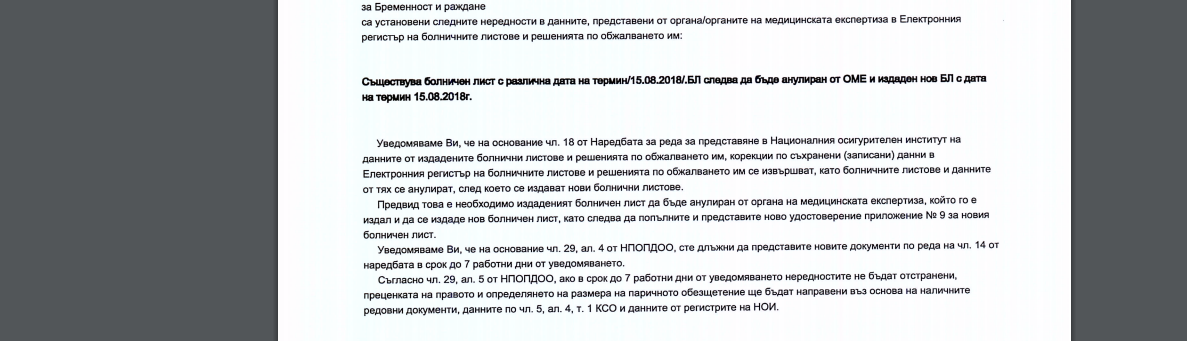 след подаване на втория болничен /за 42 дни/ от НОИ са го върнали - прилагам снимка на основанието за връщане. 45 дневния болничен ми беше от 01.07.-14.08. / с термин 15.08./, но аз родих на 14.08. и съответно от болницата ми издадоха 42 дневния болничен с дата 14.08. И днес от счетоводството се свързаха с мен, че втория болничен е върнат, но не можаха да ми обяснят защо и към кого да се обърна, за да се коригира грешката /понеже не родих при следящия бременността ми лекар/. Моля за съвет, кой болничен е за коригиране?