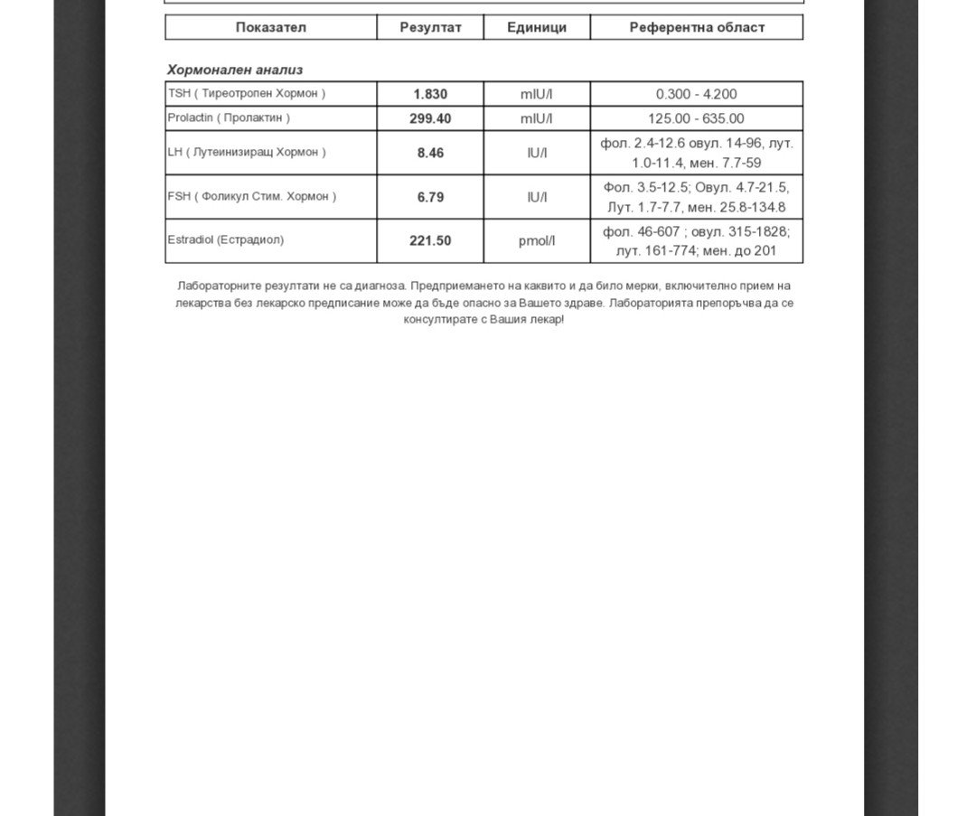От няколко месеца правим опити за бебе и тъй като съм на 37г, записах час за преглед при репродуктивен специалист. В тази връзка правих и няколко изследвания. Част от резултатите са готови и докато си чакам часа, ми е любопитно дали всичко е наред. Изследванията са правени на 4-ти ден от цикъла.
