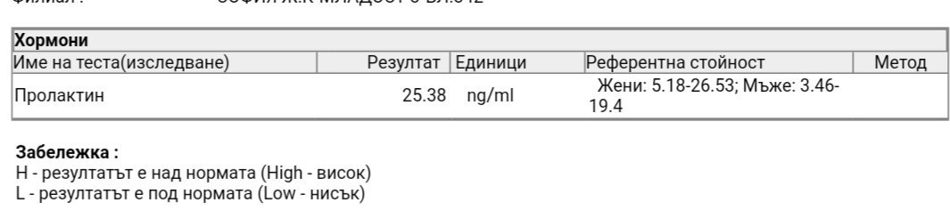 Пролактинът е висок. Трябва да провериш Андростендион, Инсулин + Глюкоза, на гладно.