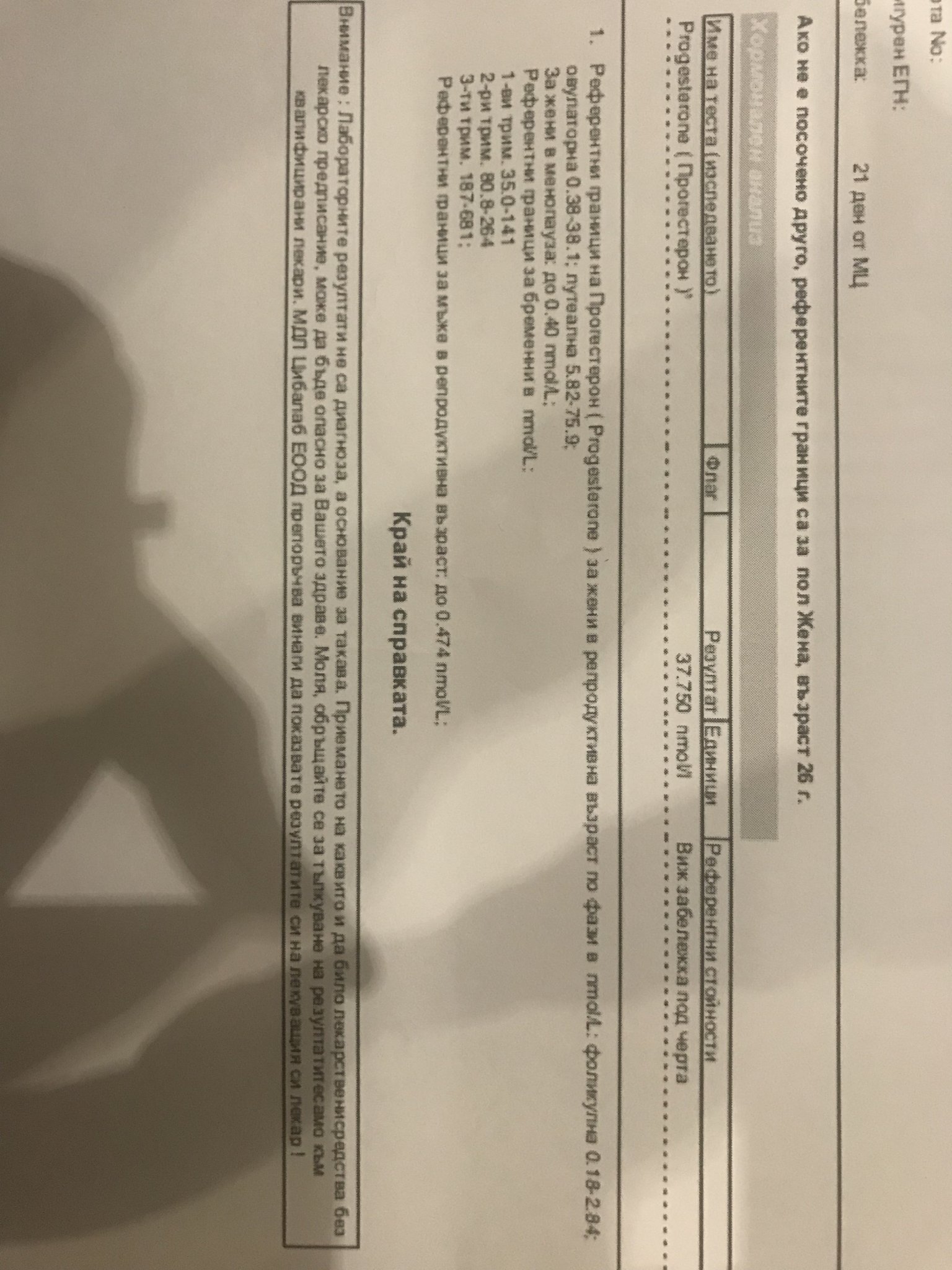 Дали може някой да сподели мнение за моите хормонални изследвания? Прогестерон е пуснат на 21ви ден от МЦ, не знам дали има връзка с резултата, че МЦ ме изненада на 23ти ден, а принципно ми е 28дни. Другите изследвания са пуснати на 3ти ден. Доки каза, че според него всичко е наред, но мен ме притеснява Прогестерона. Благодаря предварително!