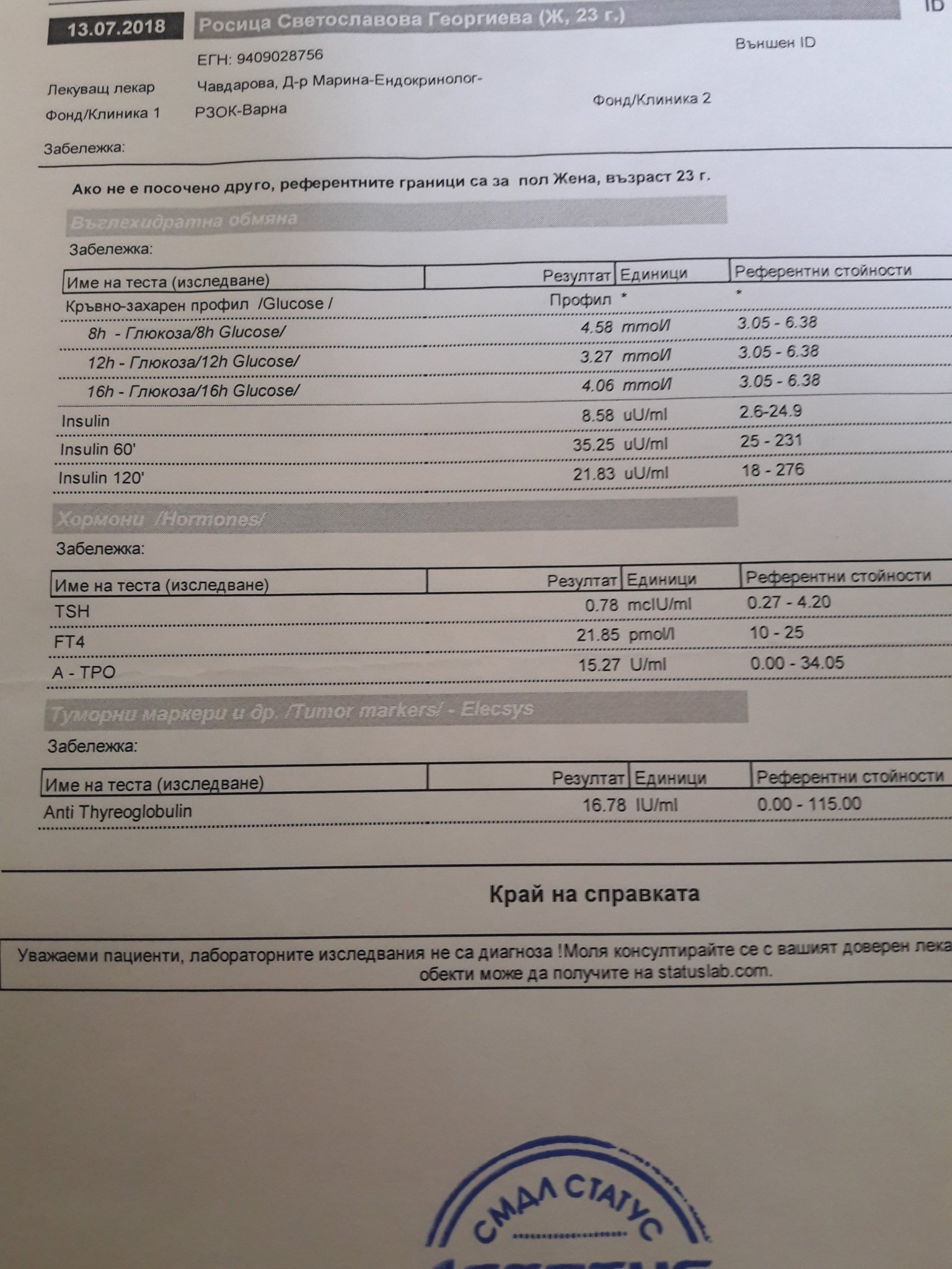 Нямам кисти, само задържани фоликули, с нормално телосложение съм и с прием на инофолик  през последните 5 месеца успях да докарам цикълът да е  на 2-3 месеца. Останалите хормони щя излязат до 10-20 дни  и на чист ден ще пусна и за щитовидната (не съм с Хашимото и досега винаги са били ок всички хормони на щитовидната). Пролактинът е съмнително висок, ще повторя на чист ден с повече почивка преди изследването)
