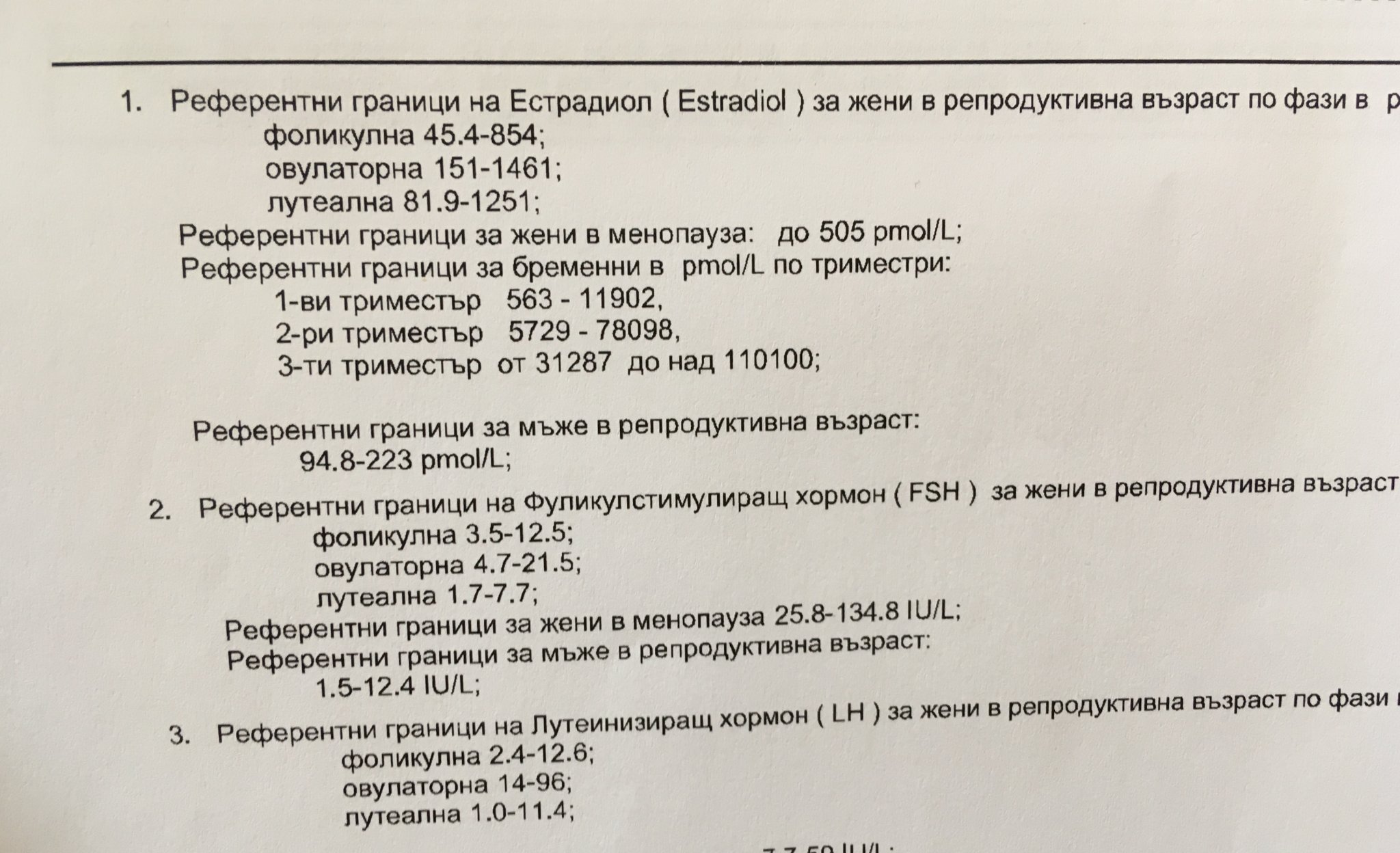 Здравейте! Може ли и коментар относно моите резултати. Изследването е направено 3ти ден от МЦ. Трябва да уточня, че съм с ПКЯ, като макар да ми закъсняваше понякога с месец, все пак след това имах М. От миналата година декември месец започнаха сериозните проблеми - до март месец нямах цикъл и съответно гинеколожката ми предписа да пия инофолик комби и дуфастон (за 5 дни). След дуфастона ми дойде, но после до юни пак нищо - след консултация с гинеколожката пих 4 месеца утрогестан (3x1 от 15ти до 25ти ден на МЦ мисля, че беше) и продължих с инофолика. След това ми обяви почивка и така след като спрях утрогестана, макар и с 2 седмици закъснение ми дойде цикълът. И на собствена глава реших да пусна изследванията. Правила съм ги сутрин в 8, гладна, жадна. За тези на ЩЖ и пролактин като ги пусках не знаех, че е по-добре да не съм в цикъл. Много ме притесняват стоностите на ТСХ и пролактин. Cold Sweat Scream  На 29 години съм и от една година се опитваме да правим бебе, безуспешно за съжаление Sob