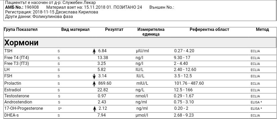Денис, може ли коментар , правени са на трети ден от Мц , с Хашимото съм, нямам антитела, но тсх е високо, качихме дозата Лт , но пролактина продължава да се повишава, септември беше 400
