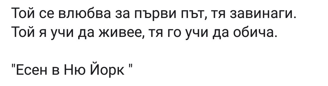 Аууу, Майче, аз обожавам тази в мазето след разказа за аборта. Като стана да си ходи виках по него да се върне, тя така го гледаше и като тръгна да се връща ехее, полудях. Много беше нежен и тя така с надежда го гледаше. Той за пореден път се видя, че не може да стои на страна от нея. Heart