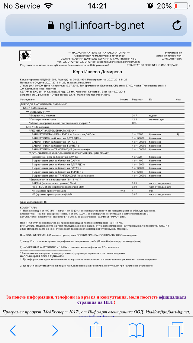 Дори и някои да ти каже има проблем или пък обратното тук няма доктори. Иди си вземи лично резултата от майчин дом и там има лекар, който ще ти обърне доста внимание и ще ти обесни за резултата.