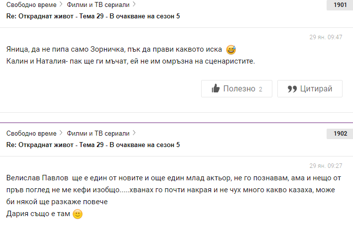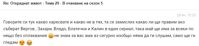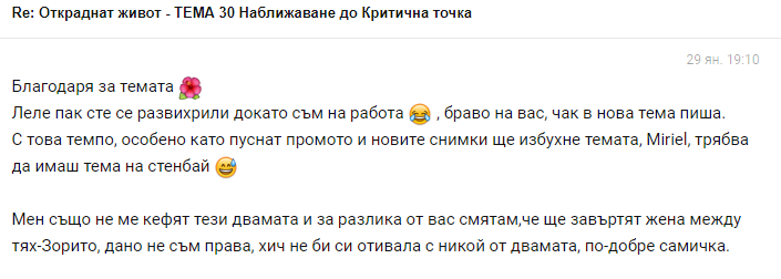 Присъединявам се към признанието хахах. От момента, в който му видях секси гърба под душа ми привлече вниманието, ама викам дай малко изпитателен срок да му дам. Ако знаеш, Моски, колко боб съм хвърлила да се съберат със Зорница. Joy Чакам опрощение. И да си призная като й каза, че е отрова поисках Банков, ама само, за да види Батко какво ще изпусне. Нали все пак искам да се съберат. Joy Сега съм влюбена загубена хахах.