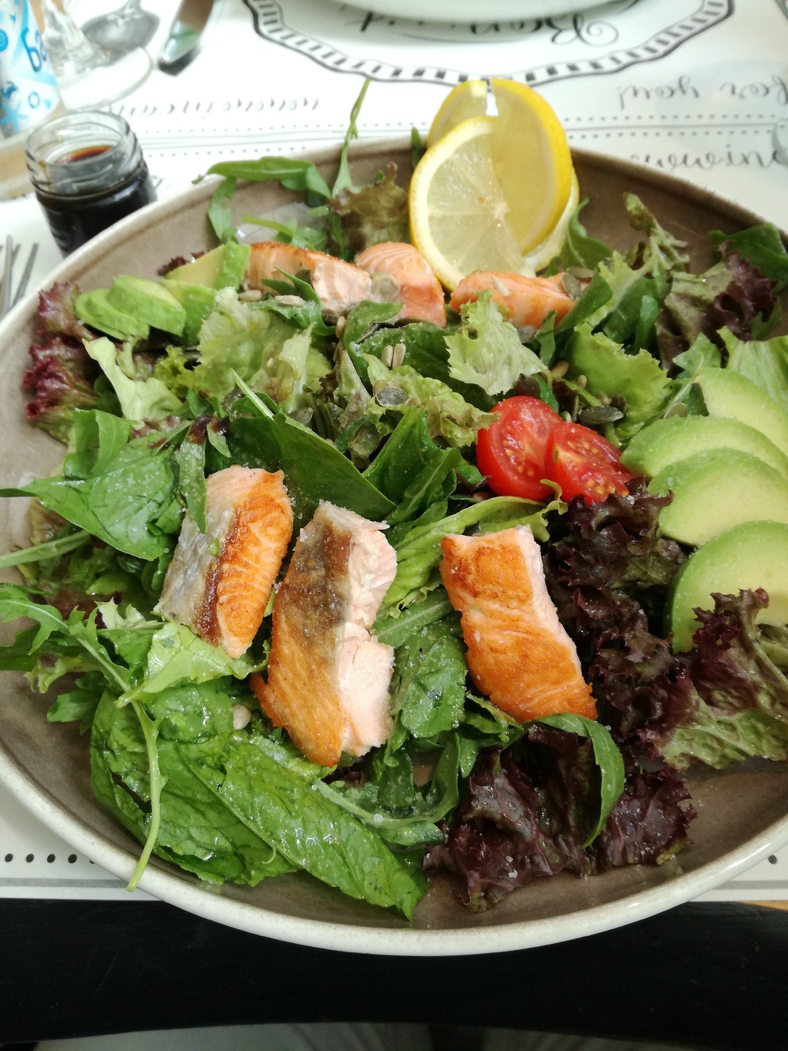 Просто вчера ме мързеше да готвя два пъти. Но днес на обяд хапнах навън ето тази красота със сьомга: