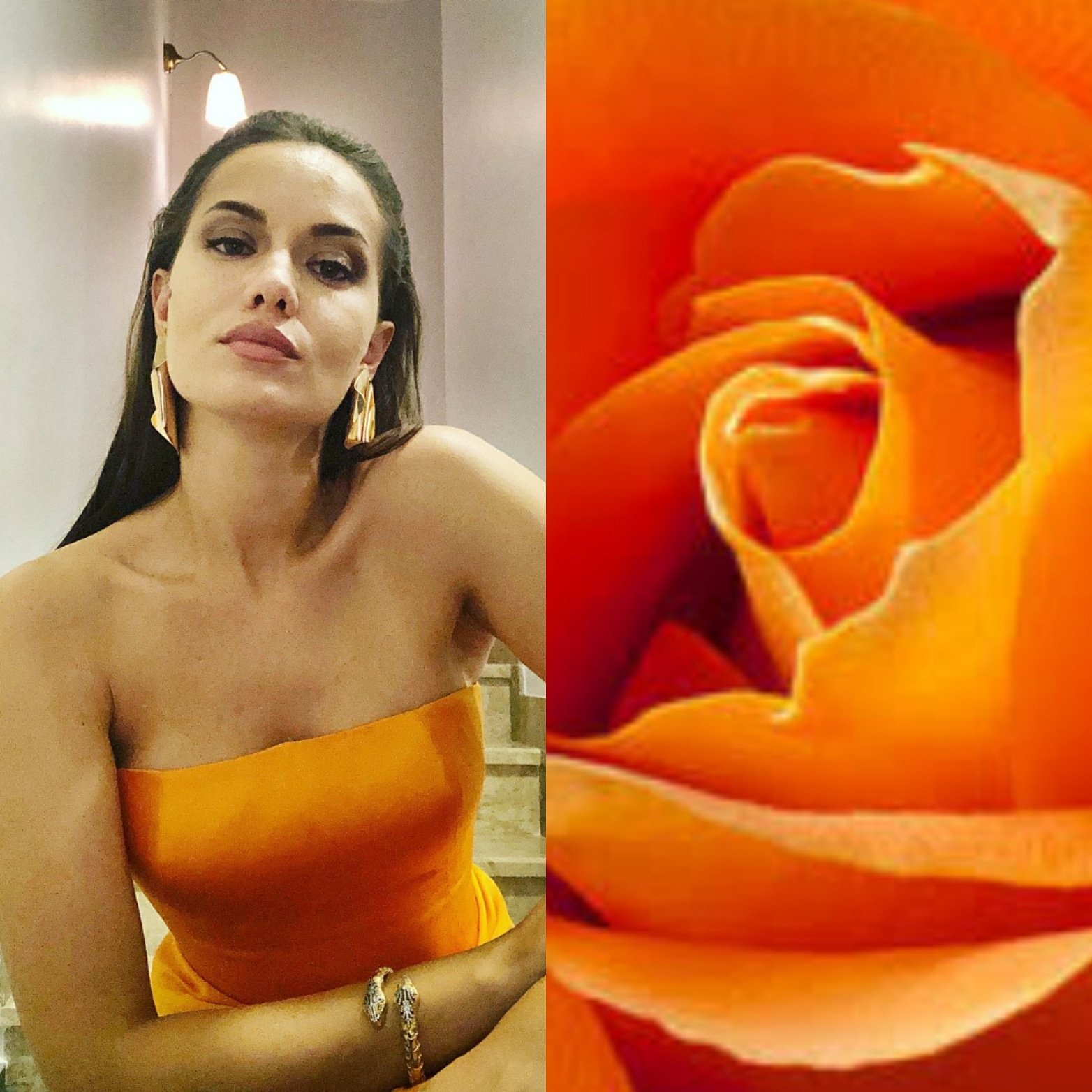 Изборът на цвят е впечатляващ -като изгарящ въображението пламък е роклята и като модел и като намек за настъпващата есен,а обиците ,леко асиметрични са  като части от кора на дърво допълват цялостното