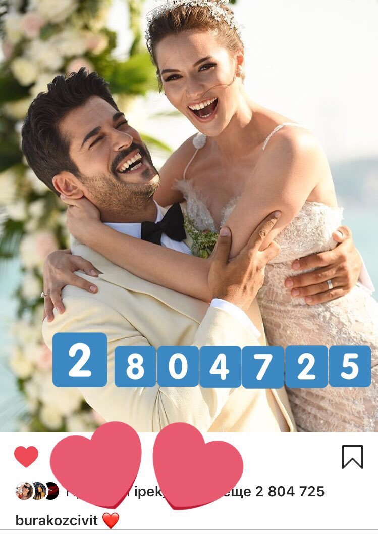 Някой си е поиграл да преброи милионите лайкове на снимките на Бурак със съпругата си. Обичани са не само в Турция.  Heart Eyes И най-важното, че тези милиони лайкове са събрани за всяко фото за по-малко от 24 часа.  Hug