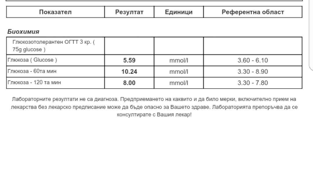 Ето ми резултатите от обременяването с глюкоза в 20 г.с - което си самоназначих , защото ми ставаше лошо като ям по-сладки неща. Сигридов ме навика - как съм могла да си пусна това изследване и колко тежко и вредно било за бебето- надявам се да е преувеличил Simple Smile